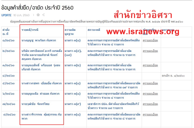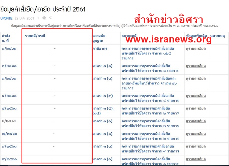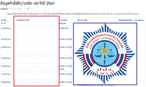 สำนักข่าวอิศรา www.isranews.org ตรวจสอบพบว่า ข้อมูลคำสั่งยึด/อายัด ประจำปี 2561 บนเว็บไซต์ของ สำนักงานป้องกันและปราบปรามการฟอกเงิน (ปปง.) ได้ทำการปิดรายชื่อผู้ถูกคำสั่ง (รายคดี/กรณี) โดยข้อมูลคำสั่งยึด/อายัดของปีอื่นๆ ยังปรากฏรายชื่อของผู้ถูกคำสั่งอยู่ (ดูภาพประกอบ)