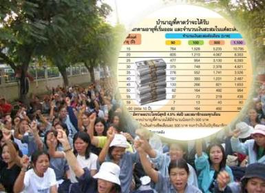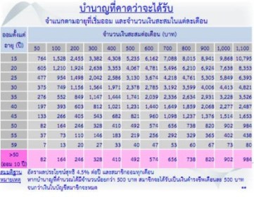 เช่น ถ้าสมาชิกเริ่มสะสมครบตั้งแต่อายุ 15-60ปี(ทุกเดือน) เดือนละ 50 บาท จะได้รับบำนาญเกษียณเดือนละ 764 บาท, สะสม 100 บาทได้รับ 1,528 บาท, สะสม 200 บาทได้รับ 2,455 บาท, สะสม 300 บาทได้รับ 3,382 บาท, สะสม 400 บาทได้รับ 4,308 บาท, สะสม 500 บาทได้รับ 5,235 บาท, สะสม 600 บาทได้รับ 6,162 บาท, สะสม 700 บาทได้รับ 7,088 บาท, สะสม 800 ได้รับ 8,015 บาท, สะสม 900 บาทได้รับ 8,941 บาท, สะสม 1,000 บาทได้รับ 9,868 บาท และสมาชิกสะสม 1,100 บาทจะได้รับบำนาญ 10,795 บาท (ดูตารางและรายละเอียดเพิ่มเติมได้จากภาพ)