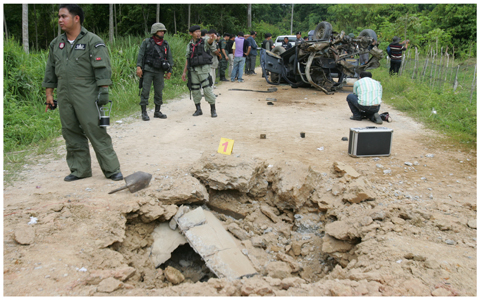 1 หลุมระเบิดขนาดใหญ่ และสภาพรถที่พังยับเยินของ อส.กะพ้อ จ.ปัตตานี หลังถูกลอบวางระเบิดขณะออกลาดตระเวน