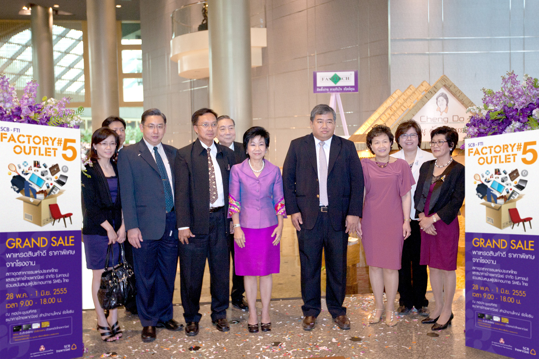 ธนาคารไทยพาณิชย์ ร่วมกับ สภาอุตสาหกรรมแห่งประเทศไทย (ส.อ.ท.) จัดมหกรรมสินค้าคุณภาพมาตรฐานส่งออก “SCB-FTI Factory Outlet” ครั้งที่ 5 นำสินค้ากว่า 240 แบรนด์ พร้อมส่วนลดสูงสุดถึง 70% มาให้ผู้บริโภคได้เลือกสรร ระหว่างวันที่ 28 พฤษภาคม – 1 มิถุนายน 2555 ตั้งแต่เวลา 09.00 – 18.00 น. ณ หอประชุมมหิศร ธนาคารไทยพาณิชย์ สำนักงานใหญ่ (รัชโยธิน) โดยงานในครั้งนี้จัดขึ้นเพื่อส่งเสริมโอกาสธุรกิจให้แก่ผู้ประกอบการ SMEs จากอุตสาหกรรมต่างๆ และช่วยเหลือผู้บริโภคให้ได้ซื้อสินค้าในราคาย่อมเยา ซึ่งเป็นการกระตุ้นให้เกิดการใช้จ่ายภายในประเทศมากขึ้นอันเป็นส่วนหนึ่งในการขับเคลื่อนเศรษฐกิจโดยรวมของประเทศ คาดสามารถเพิ่มรายได้ให้แก่ภาคอุตสาหกรรมโดยเฉพาะธุรกิจ SMEs กว่า 25 ล้านบาท