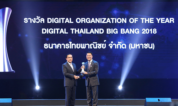 พลเอกประยุทธ์ จันทร์โอชา นายกรัฐมนตรี ให้เกียรติเป็นประธานมอบรางวัลเกียรติยศ Prime Minister’s Digital Award 2018 โดยธนาคารไทยพาณิชย์ได้รับการคัดเลือกในประเภทรางวัล Digital Organization of the year สะท้อนผลงานการสร้างสรรค์ด้านนวัตกรรมเทคโนโลยีดิจิทัลที่โดดเด่นในการพัฒนาผลิตภัณฑ์หรือบริการรูปแบบใหม่ นำเทคโนโลยีมาแก้ปัญหาเชิงธุรกิจ ส่งผลให้มีการพัฒนาคุณภาพชีวิตทั้งด้านสังคม เศรษฐกิจ วัฒนธรรมและความมั่นคงปลอดภัยสำหรับประชาชนและเป็นที่ประจักษ์ในระดับชาติและนานาชาติ โดยมีนายอาทิตย์ นันทวิทยา กรรมการผู้จัดการใหญ่และประธานเจ้าหน้าที่บริหาร ธนาคารไทยพาณิชย์ เข้ารับรางวัลภายในงาน Digital Thailand Big Bang 2018: Thailand Big Data ซึ่งจัดโดย สำนักงานส่งเสริมเศรษฐกิจดิจิทัล กระทรวงดิจิทัลเพื่อเศรษฐกิจและสังคม ณ ศูนย์แสดงสินค้าและการประชุมอิมแพ็ค เมืองทองธานี