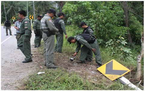 1 เจ้าหน้าที่กำลังตรวจจุดเกิดเหตุคนร้ายลอบวางระเบิดดักสังหารทหารชุด รปภ.ครู โรงเรียนบ้านเนียง อ.เมือง จ.ยะลา เมื่อวันอังคารที่ 29 พ.ค. โชคดีไม่มีกำลังพลได้รับบาดเจ็บ