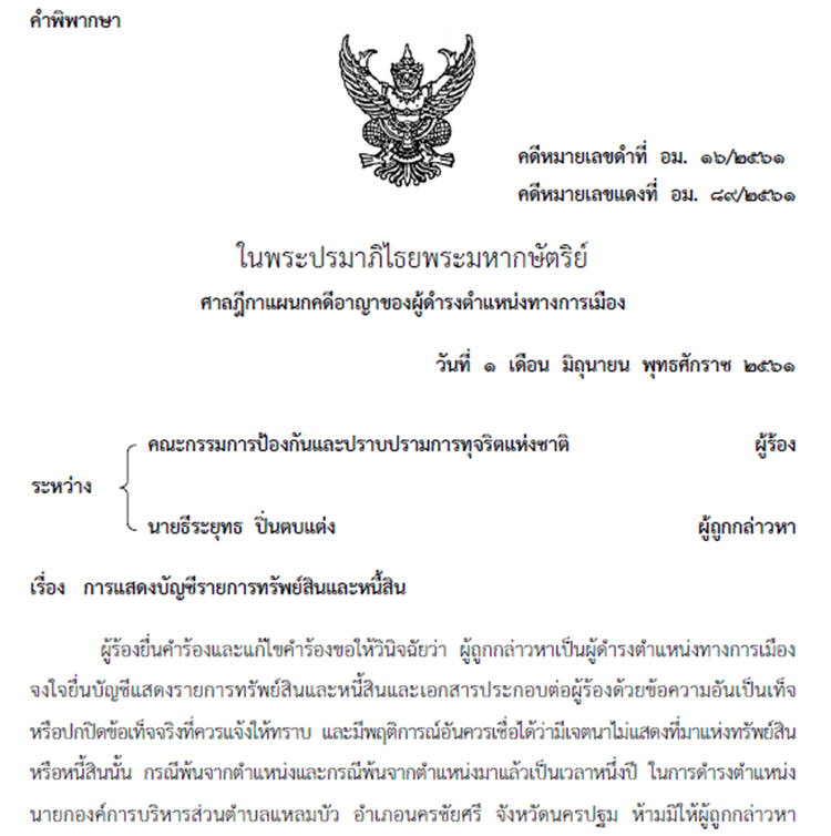 พิพากษาว่า นายธีระยุทธ ปิ่นตบแต่ง ผู้ถูกกล่าวหาจงใจยื่นบัญชีแสดงรายการทรัพย์สิน และหนี้สินและเอกสารประกอบต่อคณะกรรมการ ป.ป.ช. ด้วยข้อความอันเป็นเท็จหรือปกปิดข้อเท็จจริง ที่ควรแจ้งให้ทราบ กรณีพ้นจากตำแหน่งและกรณีพ้นจากตำแหน่งมาแล้วเป็นเวลาหนึ่งปี ในการดำรงตำแหน่ง นายก อบต. แหลมบัว ห้ามมิให้ผู้ถูกกล่าวหาดำรงตำแหน่งทางการเมืองหรือดำรงตำแหน่งใดในพรรคการเมืองเป็นเวลาห้าปี นับแต่วันที่ 31 ส.ค.2555 ซึ่งเป็นวันที่ผู้ถูกกล่าวหาพ้นจากตำแหน่ง กับมีความผิดตามพระราชบัญญัติประกอบรัฐธรรมนูญว่าด้วยการป้องกันและปราบปรามการทุจริต พ.ศ. 2542 มาตรา 119 การกระทำของผู้ถูกกล่าวหาเป็นความผิดหลายกรรมต่างกัน ให้ลงโทษทุกกรรมเป็นกระทงความผิดไป จำคุกกระทงละ 2 เดือน รวม 2 กระทง เป็นจำคุก 4 เดือน ผู้ถูกกล่าวหาให้การรับสารภาพ เป็นประโยชน์แก่การพิจารณา มีเหตุบรรเทาโทษ ลดโทษให้กึ่งหนึ่ง คงจำคุก 2 เดือน นับโทษผู้ถูกกล่าวหา ต่อจากโทษจำคุกของจำเลยในคดีอาญา หมายเลขแดงที่ อย.258/2558 ของศาลอาญา.(คดีหมายเลขแดงที่ อม. 89/2561 -1 มิ.ย.2561)