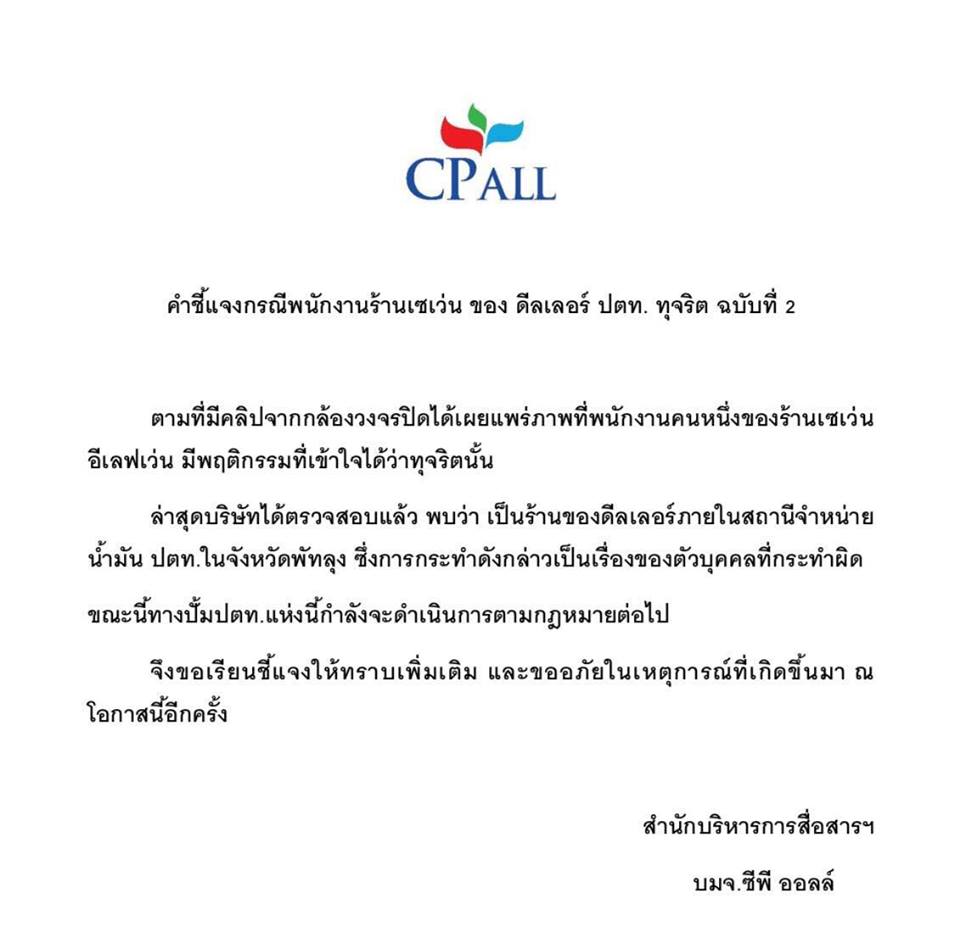 ต่อมาบริษัท CPALL ได้เผยแพร่คำชี้แจงกรณีนี้เป็นทางการ ระบุว่า "ตามที่มีคลิปจากกล้องวงจรปิดได้เผยแพร่ภาพที่พนักงาน คนหนึ่งของร้านเซเว่น อีเลฟเว่น มีพฤติกรรมที่เข้าใจได้ว่าส่อไป ในทางทุจริตนั้น