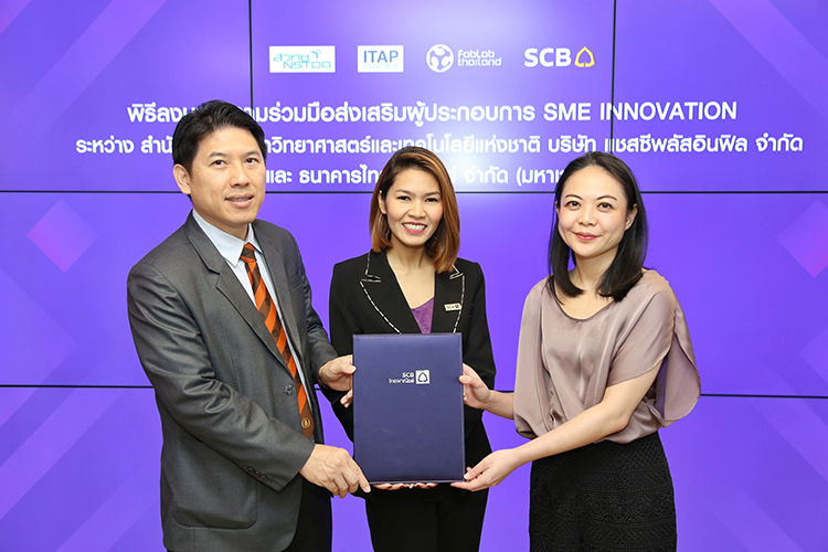 ธนาคารไทยพาณิชย์ ผนึกกำลัง สำนักงานพัฒนาวิทยาศาสตร์และเทคโนโลยีแห่งชาติ (สวทช) และบริษัท แชสซีพลัสอินฟิล จำกัด (FABLAB) พันธมิตรทางด้านวิทยาศาสตร์ เทคโนโลยีและนวัตกรรมชั้นนำ ลงนามความร่วมมือส่งเสริมผู้ประกอบการ SME INNOVATION เดินหน้าสนับสนุนผู้ประกอบการเอสเอ็มอีกลุ่มนวัตกรรมเพื่อผู้สูงอายุและธุรกิจที่เกี่ยวเนื่องทั้งระบบ รุกต่อยอด “โครงการชนชราแห่งอนาคต” จัดแคมเปญพิเศษสนับสนุนวงเงินสินเชื่อให้กับธุรกิจเอสเอ็มอีที่พัฒนาเทคโนโลยีและสร้างสรรค์นวัตกรรมในการพัฒนาธุรกิจเพื่อสร้างคุณภาพชีวิตที่ดีให้กับผู้สูงอายุ วงเงินสูงสุด 20 ล้านบาท พร้อมรับทุนสนับสนุนจาก สวทช. สูงสุด 400,000 บาท/โครงการ เพิ่มขีดความสามารถทางการแข่งขันในตลาดผู้สูงอายุทั้งในระดับประเทศและระดับสากล โดยมี รศ.ดร.รัชพล สันติวรากร ผู้อำนวยการโปรแกรม ITAP สำนักงานพัฒนาวิทยาศาสตร์และเทคโนโลยีแห่งชาติ (สวทช.) (ซ้าย) นางสาวอรุณี บุญเกิด ผู้อำนวยการ SME Value Partner ธนาคารไทยพาณิชย์ (กลาง) และนางสาวกัลยา โกวิทวิสิทธิ์ กรรมการผู้จัดการ บริษัท แชสซีพลัสอินฟิล จำกัด (ขวา) ลงนามความร่วมมือ ณ SCB Business Center สยามสแควร์