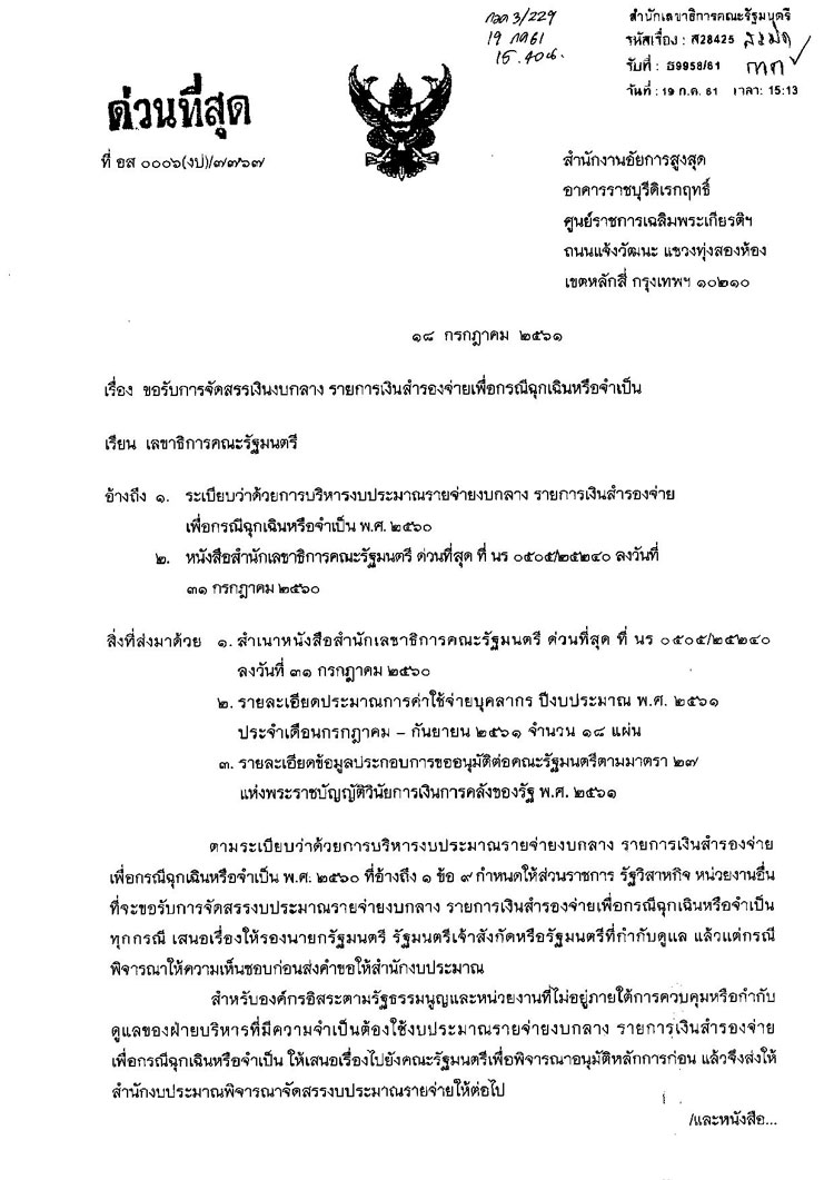 เมื่อวันที่ 18 ก.ค. 2561 สำนักงานอัยการสูงสุด ทำหนังสือด่วนที่สุด ลงนามโดยนายเข็มชัย ชุติวงศ์ อัยการสูงสุด (อสส.) ถึงเลขาธิการคณะรัฐมนตรี ขอให้นำเรื่องเสนอคณะรัฐมนตรี ขอรับการจัดสรรงบกลาง รายการเงินสำรองจ่ายเพื่อกรณีฉุกเฉินหรือจำเป็น