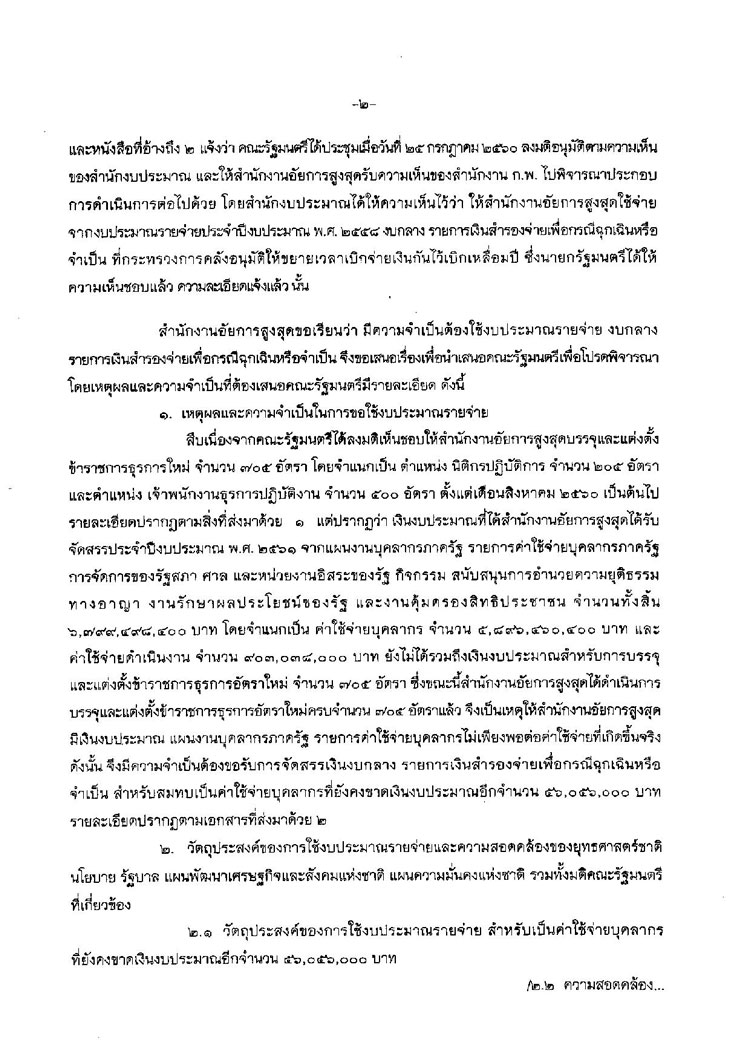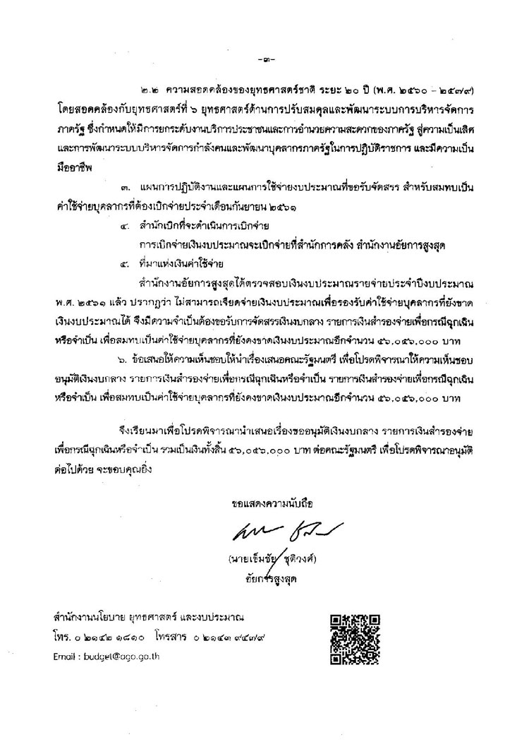 นอกจากนี้ สำนักงาน ก.พ. ยังเสนอความเห็นว่า เห็นด้วยตามแนวทางการขอรับการจัดสรรเงินงบกลางดังกล่าวของสำนักงาน อสส. จำนวน 705 อัตรา รวมเป็นเงิน 56,056,000 บาท อย่างไรก็ดีสำนักงาน ก.พ. เห็นว่า สำนักงาน อสส. ควรพิจารณาจัดทำแผนบริหารอัตรากำลังให้มีความชัดเจน เหมาะสมกับทิศทางการบริหารงานภาครัฐรูปแบบใหม่ ที่เน้นการจ้างงานในรูปแบบอื่น ๆ ตามความจำเป็นของภารกิจ รวมทั้งควรพิจารณาการนำเทคโนโลยีมาปรับใช้ เพื่อเป็นการประหยัดงบประมาณ และลดภาระผูกพันงบประมาณในระยะยาวด้วย (ดูเอกสารประกอบ)