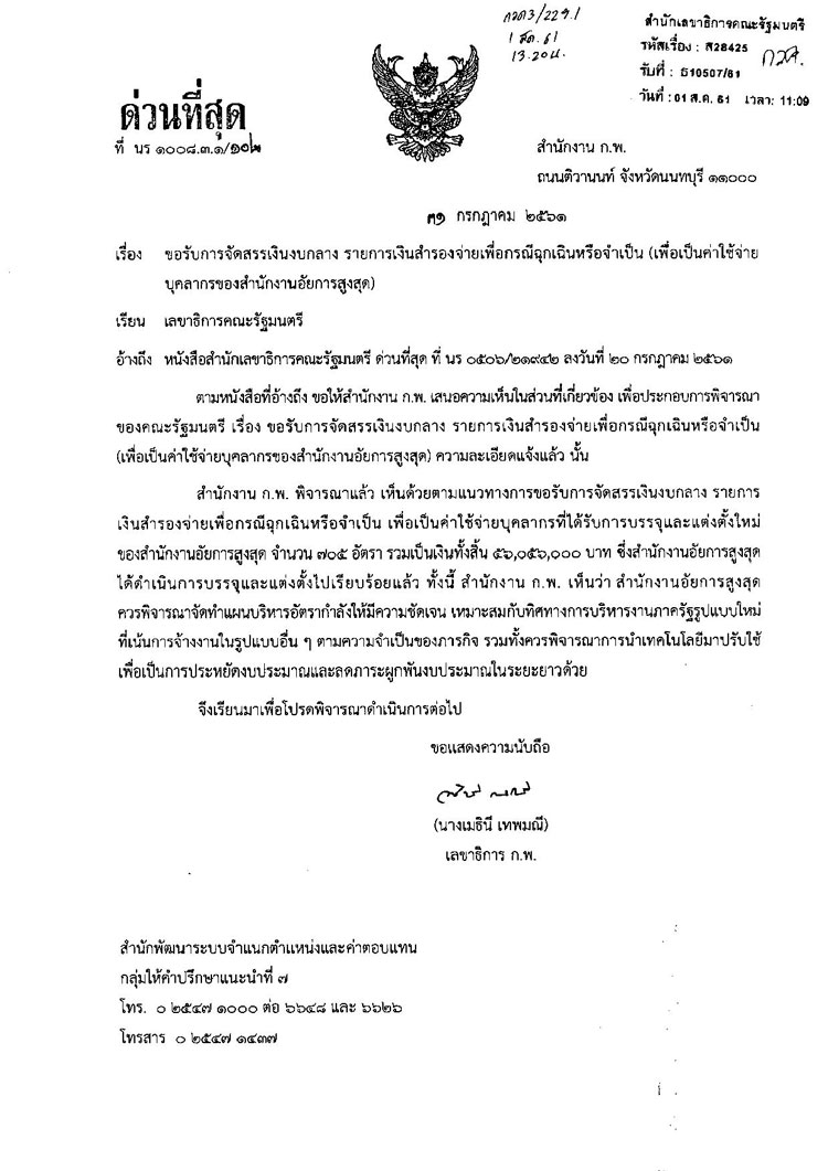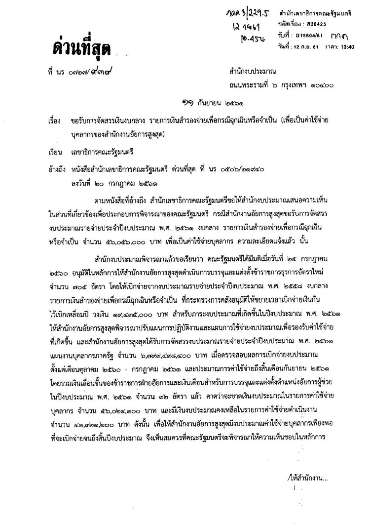 ต่อมาเลขาธิการคณะรัฐมนตรี ได้ทำหนังสือถึงสำนักงบประมาณ สำนักงาน ก.พ. และกระทรวงการคลัง เพื่อให้นำเสนอความเห็นกรณีนี้ โดยเมื่อวันที่ 11 ก.ย. 2561 สำนักงบประมาณ ได้ตอบความเห็น ระบุว่า จากกรณีคณะรัฐมนตรีได้อนุมัติหลักการให้สำนักงาน อสส. ดำเนินการบรรจุและแต่งตั้งข้าราชการธุรการอัตราใหม่ 705 อัตรา โดยให้เบิกจ่ายจากงบประมาณรายจ่ายประจำปี 2558 งบกลาง ที่กระทรวงการคลังอนุมัติให้ขยายเวลาเบิกจ่ายกันไว้เบิกเหลื่อมปี วงเงิน 19,435,000 บาท