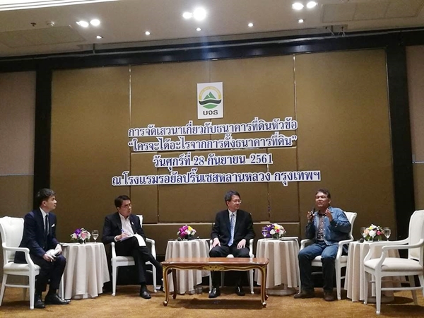 วันที่ 28 กันยายน สถาบันบริหารจัดการธนาคารที่ดิน (องค์การมหาชน) หรือ บจธ.จัดเสวนาเกี่ยวกับธนาคารที่ดิน หัวข้อ “ใครจะได้อะไรจากการตั้งธนาคารที่ดิน” ณ ห้องราชดำเนิน โรงแรมรอยัล ปริ๊นเซส หลานหลวง ถนนหลานหลวง เขตป้อมปราบ กรุงเทพมหานคร โดยพลโทชาญชัย ภู่ทอง ประธานคณะกรรมาธิการการปกครองท้องถิ่น สภานิติบัญญัติแห่งชาติ กล่าวเปิดการเสวนา