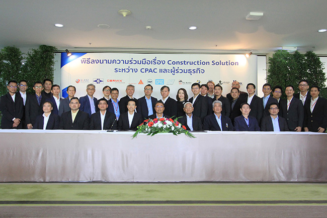 เอสซีจี โดย บริษัทผลิตภัณฑ์และวัตถุก่อสร้าง จำกัด หรือ CPAC ลงนามความร่วมมือทางธุรกิจ “Construction Solution” กับพันธมิตรธุรกิจ 11 บริษัท เพื่อพัฒนาโซลูชั่นการก่อสร้างที่ดียิ่งขึ้นสำหรับลูกค้าในอุตสาหกรรมก่อสร้างที่ปัจจุบันต้องการบริการแบบครบวงจร โดย CPAC ซึ่งถือเป็นผู้เชี่ยวชาญด้านคอนกรีตผสมเสร็จ ได้นำเทคโนโลยีการผลิตเพื่อให้ได้สินค้าคุณภาพสูง พร้อมเทคโนโลยีและเครื่องมือการบริการล้ำสมัยที่มี เช่น การออกแบบ การตรวจสอบโครงสร้าง และเทคโนโลยีด้านการขนส่ง มาเสริมกับนวัตกรรมของพันธมิตรที่มีความแข็งแกร่งในแต่ละด้าน เพื่อพัฒนาเป็นโซลูชั่นในระยะแรกทั้งหมด 9 โซลูชั่น ให้ลูกค้าได้รับสินค้าคุณภาพพร้อมบริการที่ตอบโจทย์แบบครบวงจร เช่น Lifetime Solution ซึ่งให้บริการตั้งแต่การสำรวจและตรวจประเมินสภาพความเสียหายของโครงสร้างอาคารด้วยเครื่องมือและอุปกรณ์ทางวิศวกรรม รวมถึงการสำรวจโดยใช้เครื่องบินเล็กไร้คนขับ (Flying Drone) และเรือบังคับที่มีความแม่นยำและทันสมัย แล้วนำผลมาวิเคราะห์ ออกแบบ กำหนดวิธีการ ตลอดจนให้คำปรึกษาโดยผู้เชี่ยวชาญในแต่ละสาขา พร้อมดำเนินการซ่อมแซม ต่อเติม และเสริมกำลังโครงสร้างให้อย่างเบ็ดเสร็จ