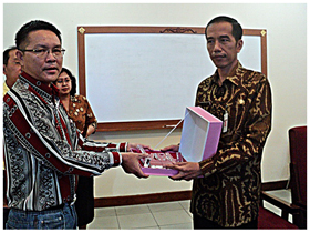 4 ผศ.ดร.สมบัติ โยธาทิพย์ คณบดีคณะมนุษยศาสตร์และสังคมศาสตร์ มหาวิทยาลัยราชภัฏยะลา กำลังมอบของที่ระลึกแก่ "จาโกวี" นายกเทศมนตรี "ดีเด่น" แห่งเมืองสุระการ์ตา (โซโล) ในคราวไปศึกษาดูงานด้านธรรมาภิบาลและการกระจายอำนาจในอินโดนีเซียระหว่างวันที่ 23 – 30 ต.ค.2554