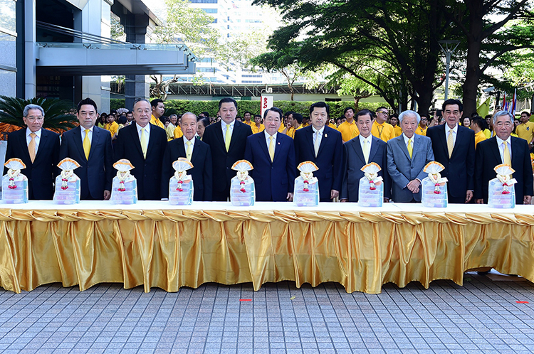 เครือเจริญโภคภัณฑ์ น้อมรำลึกในพระมหากรุณาธิคุณ พระบาทสมเด็จพระปรมินทรมหาภูมิพลอดุลยเดช บรมนาถบพิตร พร้อมใจทำบุญตักบาตร พระสงฆ์ 99 รูป เนื่องในวันคล้ายวันสวรรคต 13 ต.ค. 2561 เมื่อวันที่ 12 ต.ค. 2561 เครือเจริญโภคภัณฑ์ นำโดย นายธนินท์ เจียรวนนท์ ประธานอาวุโส นายสุภกิต เจียรวนนท์ ประธานกรรมการ นายศุภชัย เจียรวนนท์ ประธานคณะผู้บริหาร พร้อมด้วยคณะผู้บริหารระดับสูง และพนักงานจากกลุ่มธุรกิจต่างๆ พร้อมใจใส่เสื้อเหลือง และร่วมทำบุญตักบาตรพระสงฆ์ จำนวน 99 รูป เพื่อบำเพ็ญกุศลอุทิศถวาย และน้อมรำลึกในพระมหากรุณาธิคุณพระบาทสมเด็จพระปรมินทรมหาภูมิพลอดุลยเดช บรมนาถบพิตร เนื่องในโอกาสวันคล้ายวันสวรรคต 13 ต.ค.2561 ณ อาคารทรูทาวเวอร์ ถ.รัชดาภิเษก