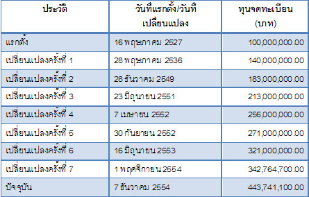ประวัติการเปลี่ยนแปลงทุนจดทะเบียน