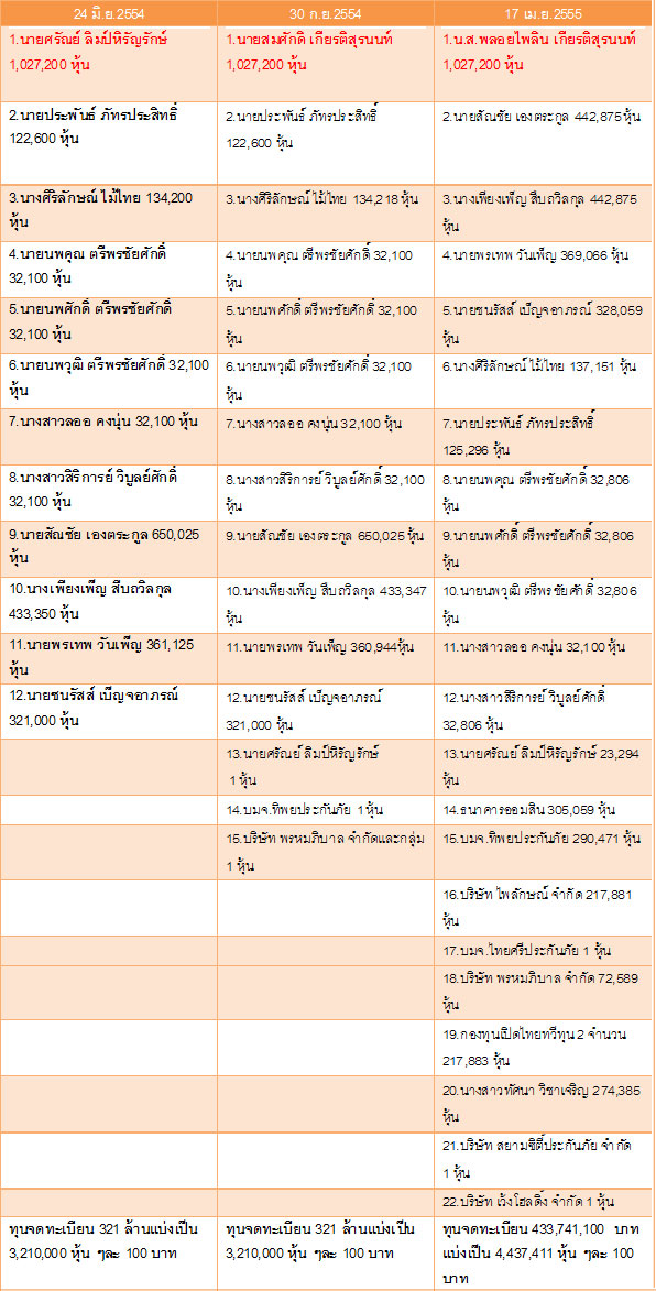 ณ วันที่ 24 มิถุนายน 2554 มีผู้ถือหุ้น 12 ราย