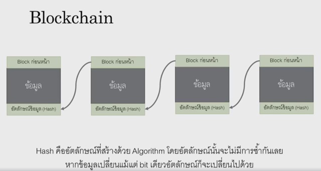 นอกจากนี้ Blockchain จะมีอัตลักษณ์ของข้อมูล (Hash) ที่สร้างด้วย Algorithm โดยอัตลักษณ์นั้นจะไม่ซ้ำกันเลย หากข้อมูลเปลี่ยนแม้แต่ Bit เดียว อัตลักษณ์ก็จะเปลี่ยนไปด้วย