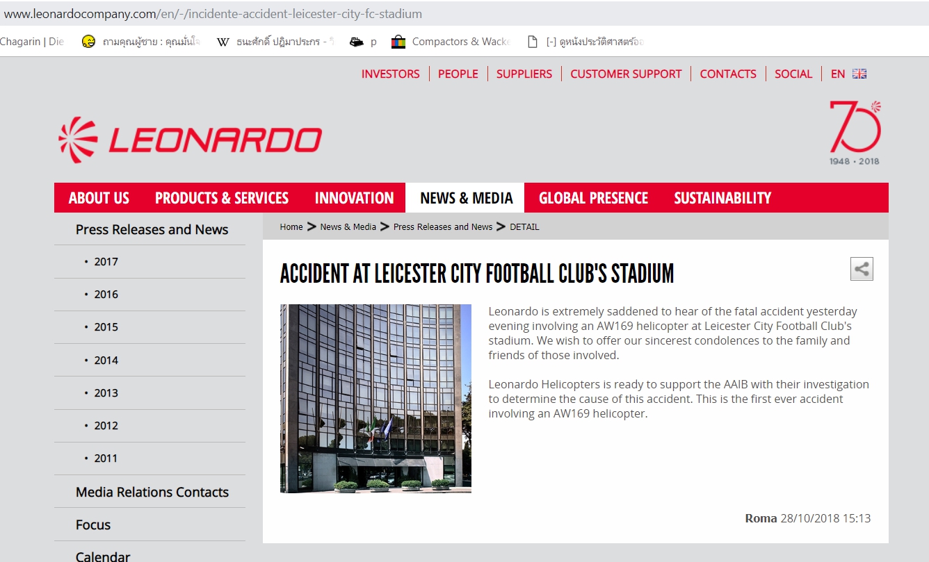 ส่วนความเคลื่อนไหวของ บริษัท Leonardo ขณะนี้ได้เตรียมความพร้อมเพื่อสนับสนุนการสอบสวนของสำนักงานตรวจสอบอุบัติเหตุทางอากาศ ( AAIB ) หาสาเหตุของการเกิดอุบัติเหตุของเฮลิคอปเตอร์ AW169 ที่ตกครั้งนี้ด้วย"