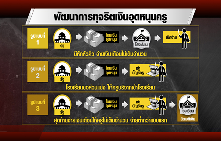 ในมุมมองของฝ่ายทหาร รูปแบบการทุจริตได้รับการพัฒนามาอย่างต่อเนื่อง จากเดิมกระทรวงศึกษาธิการส่งเงินอุดหนุนให้โรงเรียนเพื่อให้จ่ายเงินเดือนครู ปรากฏว่าโรงเรียนก็หักหัวคิว จ่ายเงินให้ครูไม่เต็มเดือน ต่อมากระทรวงศึกษาฯปรับวิธีการใหม่ ด้วยการโอนเงินตรงเข้าบัญชีเงินเดือนครู แต่ครูก็โดนโรงเรียนบังคับให้นำเงินมาบริจาคครึ่งหนึ่ง สุดท้ายกระทรวงศึกษาฯให้ครูทำเอทีเอ็ม แต่ก็โดนโรงเรียนยึดบัตรเอทีเอ็มไว้อีก แล้วก็กดเงินเดือนจ่ายครูไม่ถึงครึ่ง