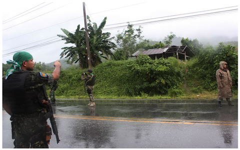 บรรยายภาพ : เจ้าหน้าที่ตรึงกำลังกลางสายฝนบริเวณจุดเกิดเหตุคนร้ายลอบวางระเบิดชุดลาดตระเวน รปภ.ครู ในพื้นที่ อ.กรงปินัง จ.ยะลา ทำให้ทหารได้รับบาดเจ็บสาหัส 1 นาย เมื่อวันพฤหัสบดีที่ 7 มิ.ย. (ภาพโดย อะหมัด รามันห์สิริวงศ์)