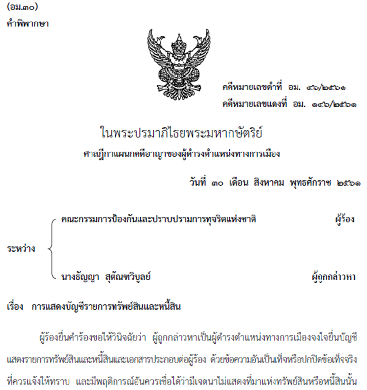 พิพากษาว่า นางธัญญา สุตัณฑวิบูลย์ ผู้ถูกกล่าวหาจงใจยื่นบัญชีแสดงรายการทรัพย์สินฯต่อผู้ร้องด้วยข้อความอันเป็นเท็จหรือปกปิดข้อเท็จจริงที่ควรแจ้งให้ทราบกรณีเข้ารับตำแหน่ง กรณีพ้นจากตำแหน่งและกรณีพ้นจากตำแหน่งมาแล้วเป็นเวลาหนึ่งปีในการดำรงตำแหน่ง นายก อบต.ป่าหวาย ตามพระราชบัญญัติประกอบรัฐธรรมนูญว่าด้วยการป้องกันและปราบปรามการทุจริต พ.ศ. 2542 มาตรา 32 และมาตรา 33 ห้ามมิให้ผู้ถูกกล่าวหาดำรงตำแหน่งทางการเมืองหรือดำรงตำแหน่งใดในพรรคการเมืองเป็นเวลาห้าปี นับแต่วันที่ 20 เม.ย.2555 ซึ่งเป็นวันที่ผู้ถูกกล่าวหาพ้นจากตำแหน่ง ตามพระราชบัญญัติประกอบรัฐธรรมนูญว่าด้วยการป้องกันและปราบปรามการทุจริต พ.ศ. 2542 มาตรา 34 วรรคสองกับมีความผิดตามพระราชบัญญัติประกอบรัฐธรรมนูญว่าด้วยการป้องกันและปราบปรามการทุจริต พ.ศ. 2542 มาตรา 119 ฐานเป็นเจ้าหน้าที่ของรัฐจงใจยื่นบัญชีแสดงรายการทรัพย์สินฯต่อผู้ร้อง ด้วยข้อความอันเป็นเท็จหรือปกปิดข้อเท็จจริงที่ควรแจ้งให้ทราบกรณีพ้นจากตำแหน่งมาแล้วเป็นเวลาหนึ่งปี จำคุก 2 เดือน และปรับ 8,000 บาท ผู้ถูกกล่าวหาให้การรับสารภาพเป็นประโยชน์แก่การพิจารณา มีเหตุบรรเทาโทษ ลดโทษให้กึ่งหนึ่ง คงจำคุก 1 เดือน และปรับ 4,000 บาท ไม่ปรากฏว่าผู้ถูกกล่าวหาเคยได้รับโทษจำคุกมาก่อนโทษจำคุกจึงให้รอการลงโทษไว้มีกำหนด 1 ปี (คดีหมายเลขแดงที่ อม.146/2561 -30 ส.ค.2561)