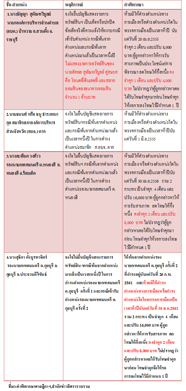3.นางสุธิดา ตั้งบูรพาจิตร์ รองนายกเทศมนตรี ต.กุยบุรี อ.กุยบุรี จ.ประจวบคีรีขันธ์ จงใจไม่ยื่นบัญชีแสดงรายการทรัพย์สินฯกรณีพ้นจากตำแหน่งมาแล้วเป็นเวลาหนึ่งปี ในการดำรงตำแหน่งรองนายกเทศมนตรี ต.กุยบุรี ครั้งที่ 1 และกรณีเข้ารับตำแหน่งรองนายกเทศมนตรี ต.กุยบุรี ครั้งที่ 2 ให้ผู้ถูกกล่าวหาพ้นจากตำแหน่งรองนายกเทศมนตรี ต.กุยบุรี ครั้งที่ 2 ที่ดำรงอยู่นับแต่วันที่ 26 ก.พ.2561 ซึ่งเป็นวันที่ศาลฎีกาแผนกคดีอาญาของผู้ดำรงตำแหน่งทางการเมืองมีคำสั่งให้ผู้ถูกกล่าวหาหยุดปฏิบัติหน้าที่ ตามพระราชบัญญัติประกอบรัฐธรรมนูญว่าด้วยวิธีพิจารณาคดีอาญาของผู้ดำรงตำแหน่งทางการเมือง 2560 มาตรา 17วรรคสอง และห้ามมิให้ผู้ถูกกล่าวหาดำรงตำแหน่งทางการเมืองหรือดำรงตำแหน่งใดในพรรคการเมืองเป็นเวลาห้าปีนับแต่วันที่ 30 ส.ค.2561 ซึ่งเป็นวันที่ศาลฎีกาฯวินิจฉัยกับมีความผิดตามพระราชบัญญัติประกอบรัฐธรรมนูญว่าด้วย การป้องกันและปราบปรามการทุจริต พ.ศ. 2542 มาตรา 119 การกระทำของผู้ถูกกล่าวหาเป็นความผิดหลายกรรมต่างกัน ให้ลงโทษทุกกรรมเป็นกระทงความผิดไป จำคุกกระทงละ 2 เดือน และปรับกระทงละ 8,000 บาท รวม 2 กระทง เป็นจำคุก 4 เดือน และปรับ 16,000 บาท ผู้ถูกกล่าวหาให้การรับสารภาพ เป็นประโยชน์แก่การพิจารณามีเหตุบรรเทาโทษ ลดโทษให้กึ่งหนึ่ง คงจำคุก 2 เดือนและปรับ 8,000 บาท ไม่ปรากฏว่าผู้ถูกกล่าวหาเคยได้รับโทษจำคุกมาก่อน โทษจำคุกจึงให้รอการลงโทษไว้มีกำหนด 1 ปี คำขออื่นนอกจากนี้ให้ยก. (คดีหมายเลขแดงที่ อม.145/2561 -30 ส.ค.2561)