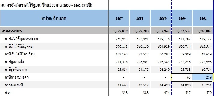 ก.คลัง รายงานผลการจัดเก็บรายได้รัฐบาล ในส่วนที่กรมสรรพากรจัดเก็บภาษีตัวใหม่ ภาษีการรับมรดก ปี 2560 จัดเก็บได้ 65 ล้านบาท -ปี 2561 จัดเก็บได้ 219 ล้านบาท