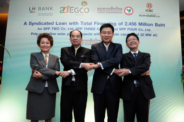 นายวศิน วณิชย์วรนันต์ (ที่ 2 จากขวา) รองกรรมการผู้จัดการ ธนาคารกสิกรไทย และนายสหัส ประทักษ์นุกูล (ที่ 2 จากซ้าย) กรรมการผู้จัดการใหญ่ เอ็กโก กรุ๊ป พร้อมด้วยผู้บริหารจากธนาคารไอซีบีซี (ไทย) และธนาคารแลนด์ แอนด์ เฮ้าส์ ร่วมพิธีลมนามในสัญญาให้ความสนับสนุนทางการเงินรวม 2,456 ล้านบาท แก่บริษัทผลิตไฟฟ้า จำกัด (มหาชน) หรือ เอ็กโก กรุ๊ป ลงทุนโรงไฟฟ้าพลังงานแสงอาทิตย์ ที่มีการติดตั้งระบบปรับแผงโซล่าร์เซลล์แบบหมุนตามดวงอาทิตย์ (Tracking System) ของเอกชนแห่งแรกในประเทศไทย โดยมีธนาคารกสิกรไทยทำหน้าที่เป็นผู้จัดการเงินกู้ (Mandated Lead Arranger) ณ ธนาคารกสิกรไทย สำนักงานใหญ่ เมื่อเร็ว ๆ นี้