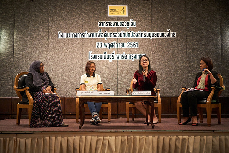 เมื่อวันที่ 23 พ.ย. 2561 ที่โรงแรมเซ็นจูรี่พาร์ค กรุงเทพฯ แอมเนสตี้ อินเตอร์เนชั่นแนล ประเทศไทย จัดเวทีพูดคุยในประเด็น “จากรายงานของยูเอ็นถึงแนวทางการทำงานเพื่อคุ้มครองนักปกป้องสิทธิมนุษยชนของไทย” โดยมีเวทีเสวนา “เรื่องเล่าของเธอ: ความท้าทายที่นักปกป้องสิทธิมนุษยชนหญิงต้องเผชิญ”