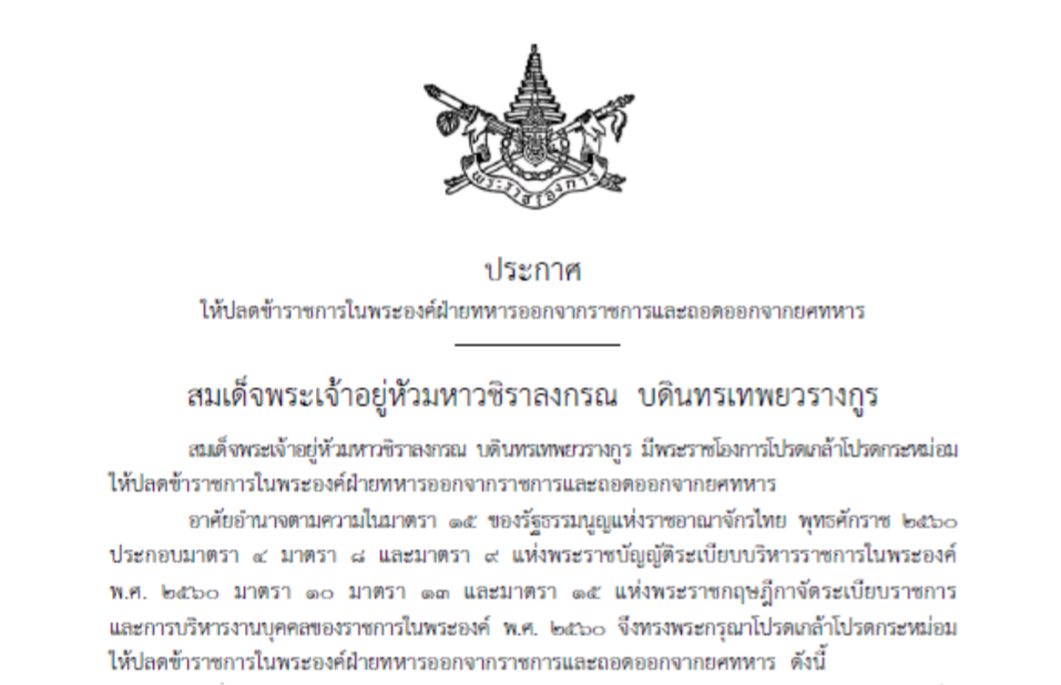ความว่า สมเด็จพระเจ้าอยู่หัวมหาวชิราลงกรณ บดินทรเทพยวรางกูร มีพระราชโองการโปรดเกล้าโปรดกระหม่อม ให้ปลดข้าราชการในพระองค์ฝ่ายทหารออกจากราชการและถอดออกจากยศทหารอาศัยอานาจตามความในมาตรา 15 ของรัฐธรรมนูญแห่งราชอาณาจักรไทย พุทธศักราช 2560 ประกอบมาตรา 4 มาตรา 8 และมาตรา 9 แห่งพระราชบัญญัติระเบียบบริหารราชการในพระองค์ พ.ศ. 2560 มาตรา 10 มาตรา 13 และมาตรา 15 แห่งพระราชกฤษฎีกาจัดระเบียบราชการและการบริหารงานบุคคลของราชการในพระองค์ พ.ศ. 2560 จึงทรงพระกรุณาโปรดเกล้าโปรดกระหม่อมให้ปลดข้าราชการในพระองค์ฝ่ายทหารออกจากราชการและถอดออกจากยศทหาร ดังนี้