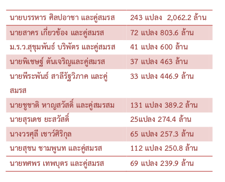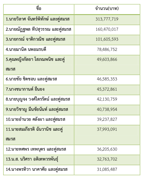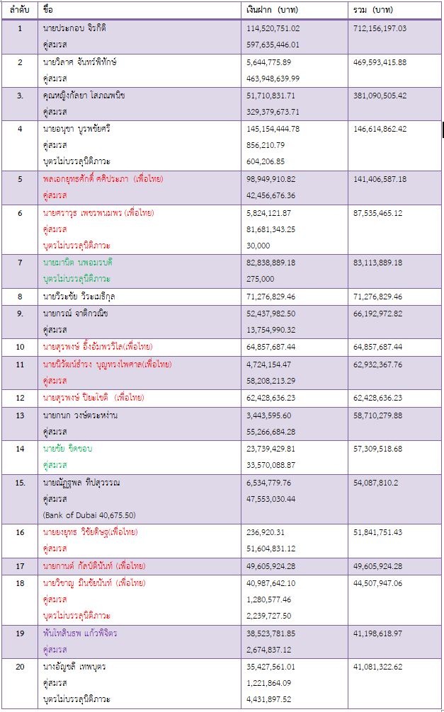 6.นายชัย ชิดชอบ อดีตประธานรัฐสภา และคู่สมรส 46,585,353 บาท 7.นางชนากานต์ ยืนยง อดีต ส.ส.ปทุมธานีพรรคประชาราช เจ้าของมหาวิทยาลัยปทุมธานี 45,372,861 บาท 8.นายบุญจง วงศ์ไตรรัตน์ อดีตรัฐมนตรีช่วยว่าการกระทรวงมหาดไทย และคู่สมรส 42,130,759 บาท 9.นายวิชาญ มีนชัยนันท์ อดีต ส.ส.กรุงเทพฯ พรรคเพื่อไทย และคู่สมรส 40,738,954 บาท 10.นายอำนวย คลังผา อดีต ส.ส.ลพบุรี พรรคเพื่อไทย และคู่สมรส 39,237,827 บาท
