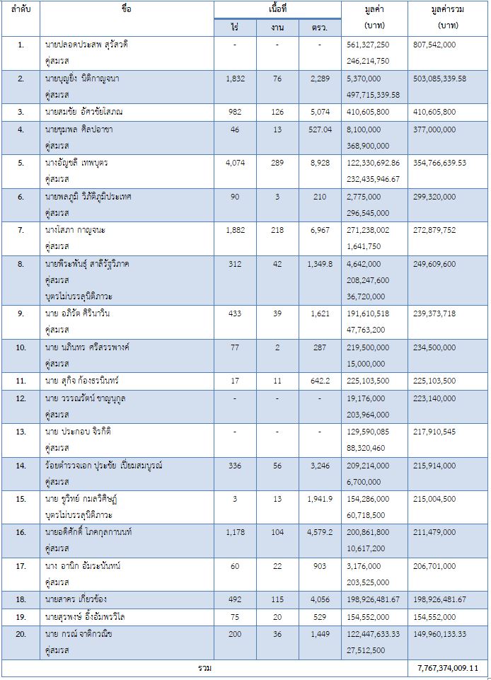 ส.ส.ที่มีที่ดินมากที่สุด 10 อันดับแรก (ตามมูลค่า)