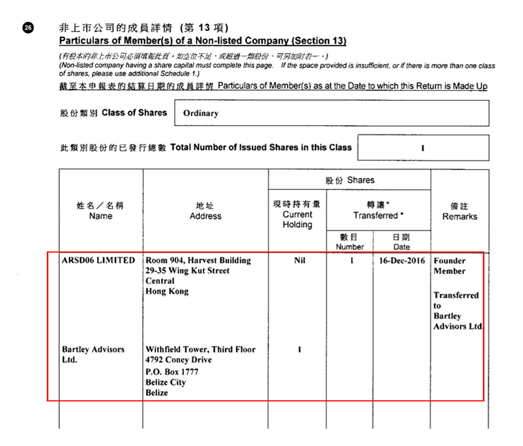 มีผู้ก่อตั้งบริษัทคือบริษัท ARSD6 Limited เพียงแค่รายเดียวเท่านั้น โดยถือหุ้นเพียงแค่ 1 หุ้น มูลค่าเป็น 1 ฮ่องกงดอลลาร์ต่อ หนึ่งหุ้น หรือคิดเป็น 4.19 บาท ตามค่าเงิน ณ เวลาปัจจุบัน