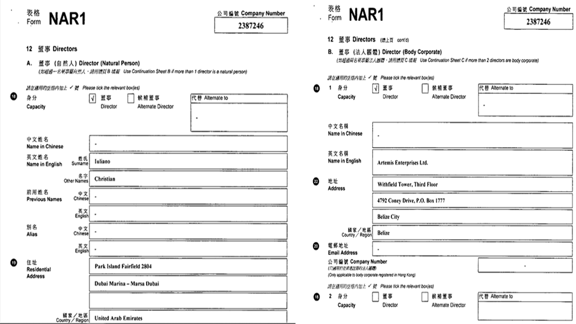 โดยในช่วงเวลาดังกล่าว มีการเปลี่ยนแปลงโครงสร้างบริษัทเพิ่มเติม ปรากฏชื่อผู้อำนวยการบริษัท ได้แก่นาย Christian Luliano สัญชาติอิตาลีทำหน้าที่เป็นผู้อำนวยการของบริษัท และมีบริษัท Artemis Enterprises จากประเทศเบลิซ ทำหน้าที่เป็นผู้อำนวยการบริษัทด้วยเช่นกัน