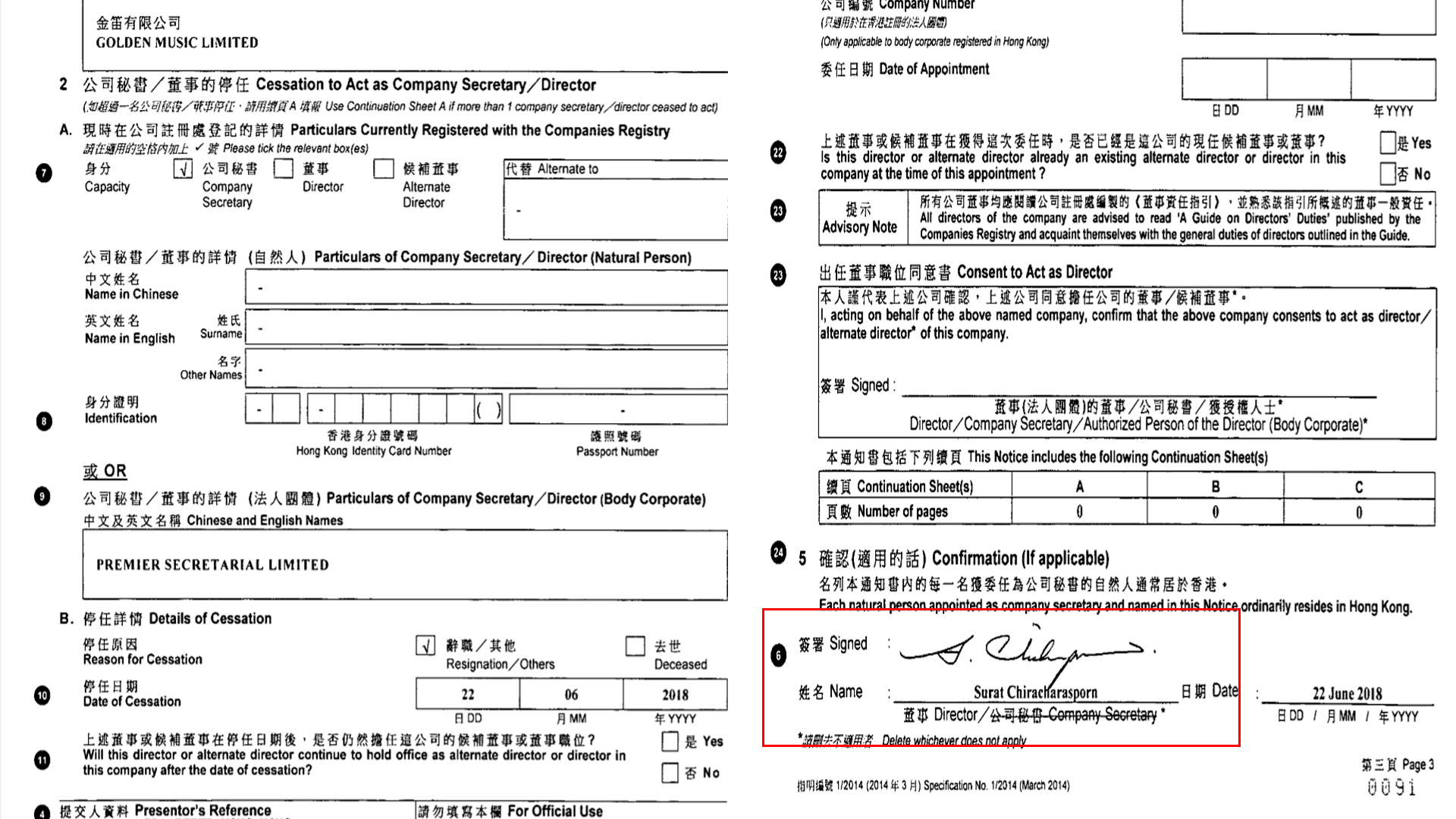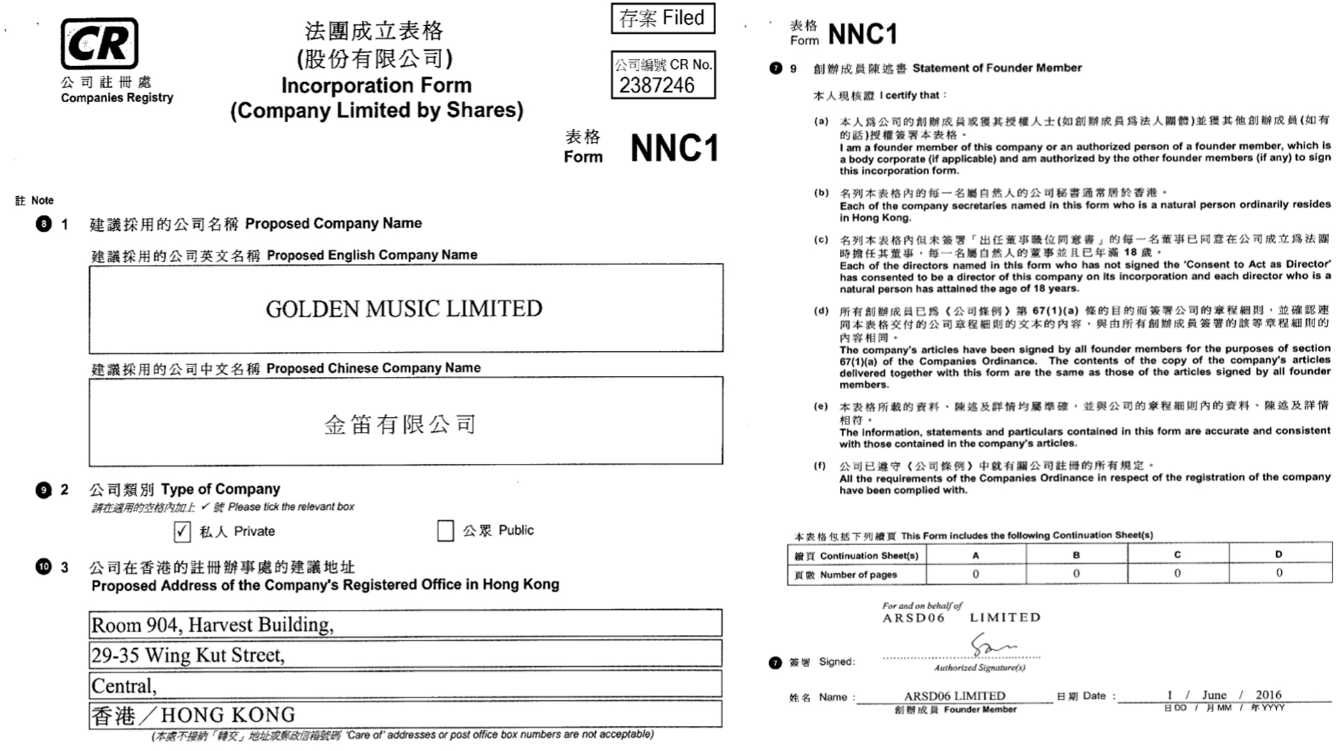 เบื้องต้น สำนักข่าวอิศรา www.isranews.org ตรวจสอบข้อมูลโครงสร้างทางธุรกิจ และผู้ถือหุ้นของ บริษัท Golden Music Limited จากเว็บไซต์กรมธุรกิจการค้าของฮ่องกง พบว่า บริษัทฯ ถูกก่อตั้งขึ้นเมื่อวันที่ 7 มิ.ย. 2559 โดยจดทะเบียนประเภทบริษัทว่าเป็นบริษัทจำกัดโดยหุ้น (Private Company Limited by Shares)