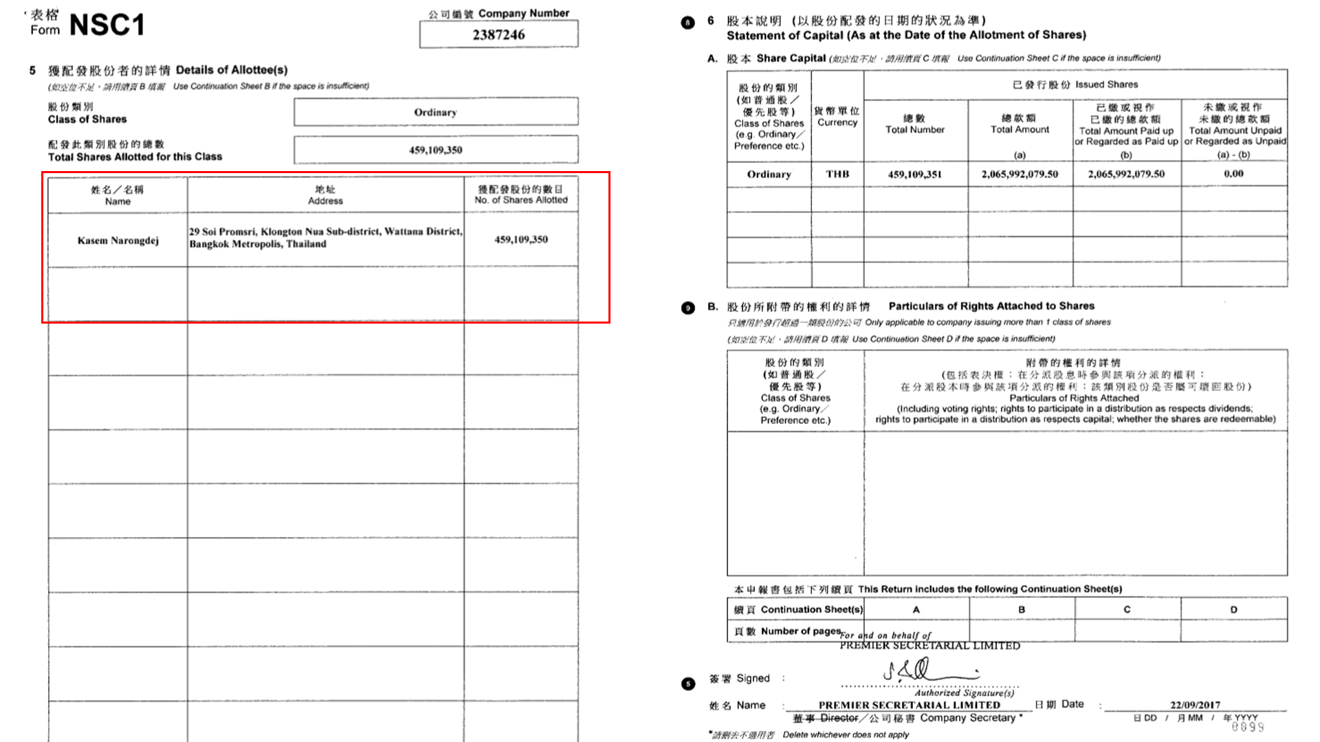 ส่วนการแจ้งข้อมูลเปลี่ยนตัว ให้คุณหญิงก่อแก้ว บุณยะจินดา แม่ภรรยานายณพ เข้ามาเป็นผู้ถือหุ้นใหญ่แทน นายเกษม ณรงค์เดช นั้น ยังไม่ปรากฎในฐานข้อมูลเว็บไซต์กรมธุรกิจการค้าของฮ่องกง ในช่วงเวลาที่สำนักข่าวอิศราเข้าไปตรวจสอบ