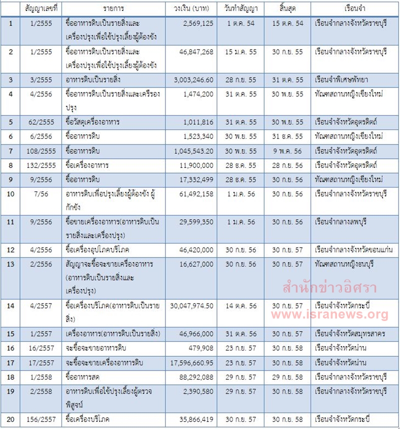 รายการที่ อ.ต.ก.เป็นค่สัญญากับเรือนจำในช่วง ปี 2555-2557