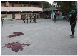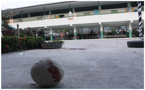 1 ลูกฟุตบอลเปื้อนเลือดหลังเกิดเหตุคนร้ายปาระเบิดแบบเอ็ม 67 ถล่มกำลังพลคาฐานทหารใน อ.กรงปินัง จ.ยะลา