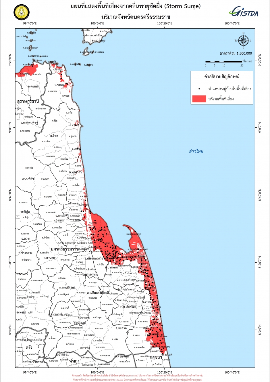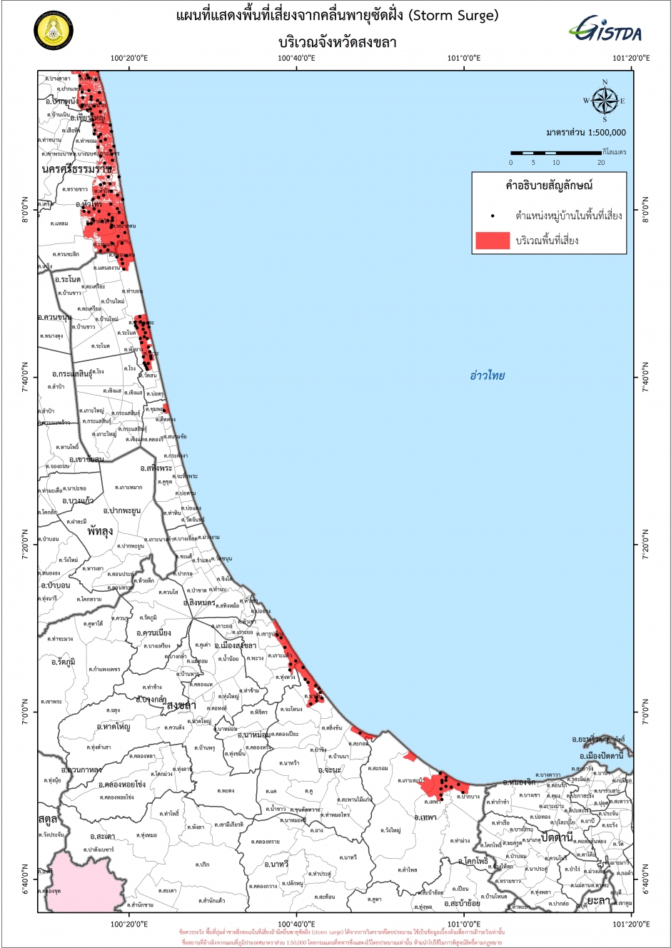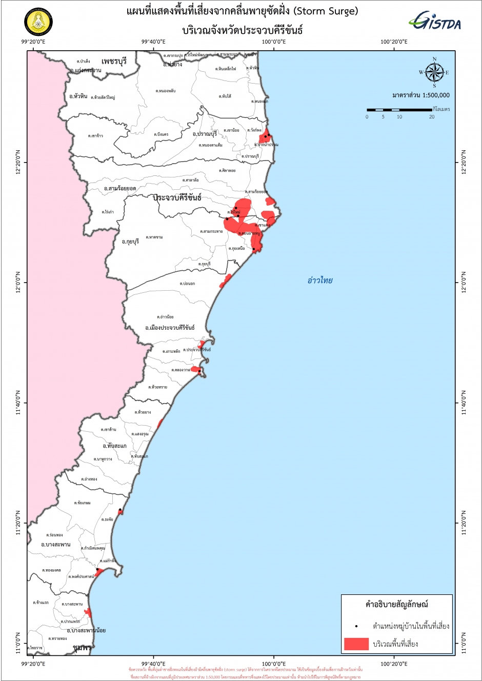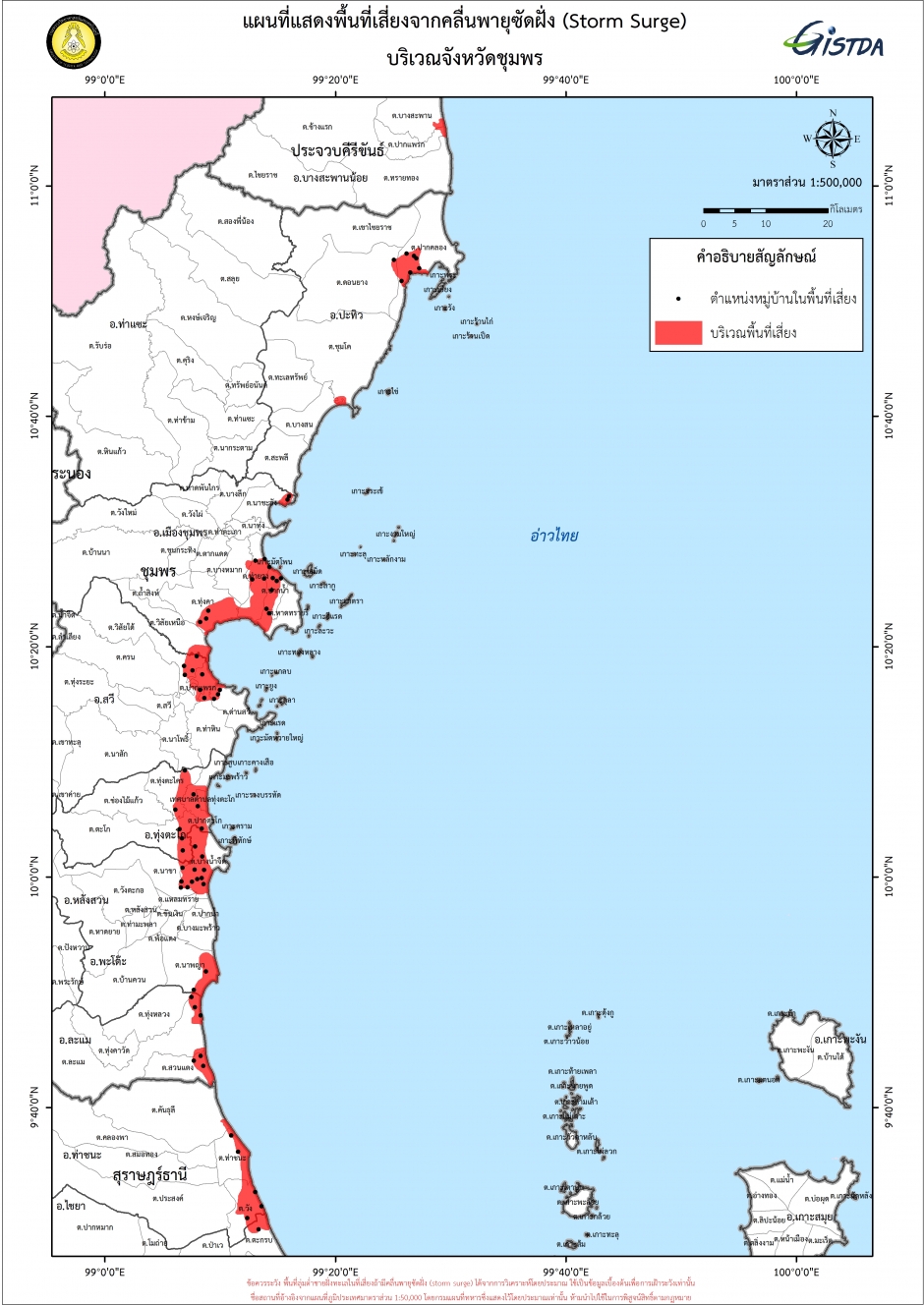 ขณะที่สำนักงานพัฒนาเทคโนโลยีอวกาศและภูมิสารสนเทศ (องค์การมหาชน) หรือจีสด้า เผยภาพแผนที่แสดงพื้นที่เสี่ยงจากคลื่นพายุซัดฝั่ง(Storm Surge) บริเวณจังหวัดชุมพร, ประจวบคีรีขันธ์, สุราษฎร์ธานี,นครศรีธรรมราช และสงขลา