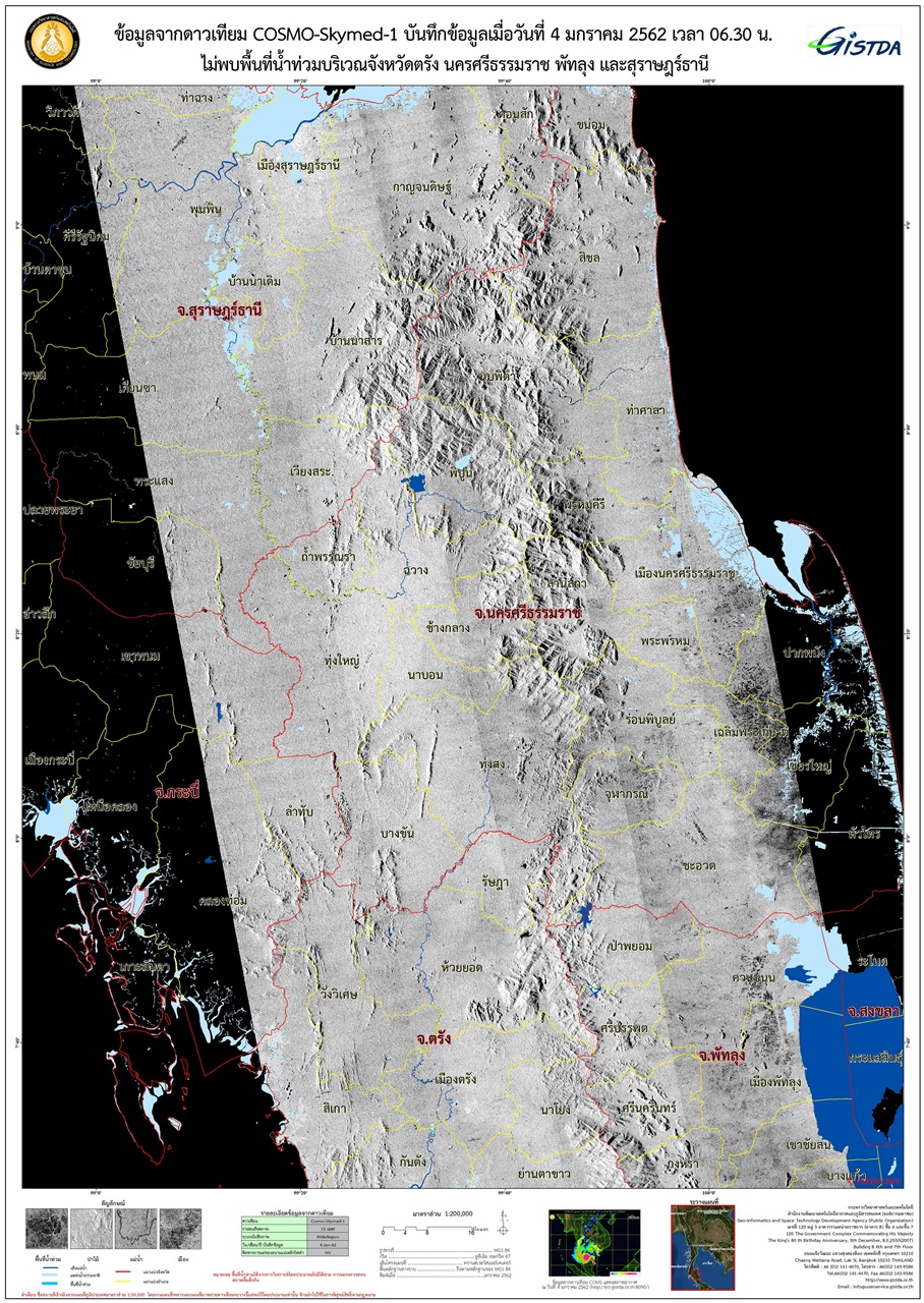พร้อมกันนี้ จิสด้าได้วิเคราะห์ข้อมูลภาพถ่ายจากดาวเทียม Cosmo-SkyMed-4 เมื่อวันที่ 4 มกราคม 2562 เวลา 06.30 น. " ยังไม่พบพื้นที่น้ำท่วม" ในบริเวณพื้นที่ลุ่มต่ำและไม่พบความเสียหายบริเวณชายฝั่ง บางส่วนของจังหวัดตรัง นครศรีธรรมราช พัทลุง และสุราษฎร์ธานี