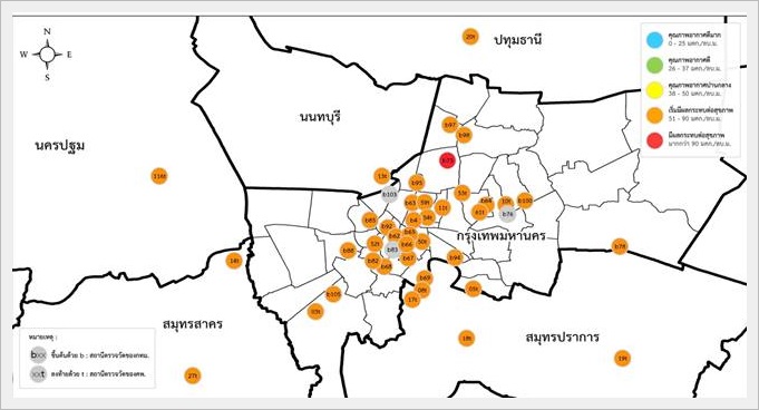 พื้นที่ริมถนน โดยสถานีวัดคุณภาพอากาศแสดงผลค่าฝุ่นละออง PM2.5 มีค่าเกินมาตรฐาน 50 มคก./ลบ.ม. อยู่ 22 พื้นที่