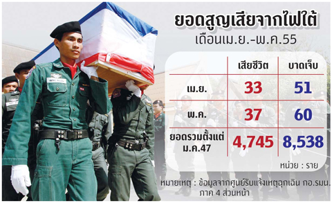 ทั้งนี้ หากนับตั้งแต่เหตุการณ์ปล้นปืนเมื่อวันที่ 4 ม.ค.2547 จนถึงสิ้นเดือน พ.ค.2555 มียอดผู้เสียชีวิตจากสถานการณ์ไฟใต้รวมทั้งสิ้น 4,745 ราย บาดเจ็บ 8,538 ราย