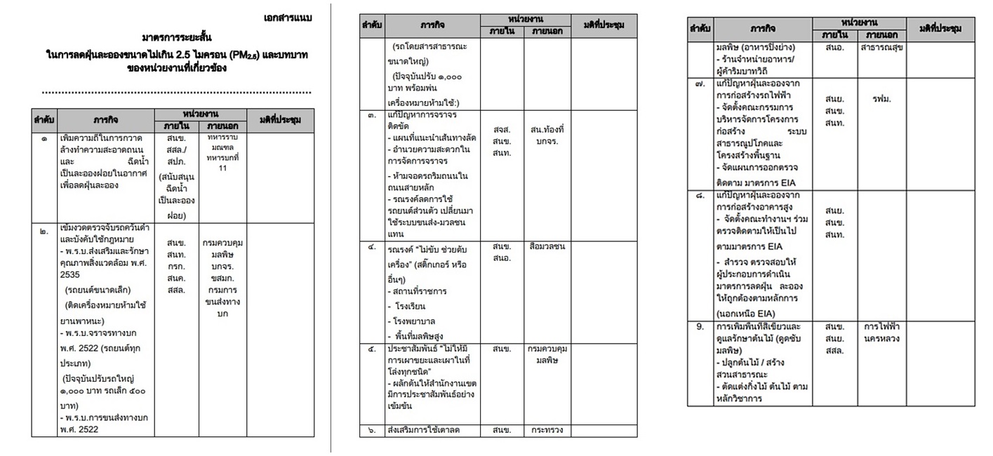 ผู้ว่าราชการกรุงเทพมหานคร กล่าวว่า นอกจากนี้ยังได้ประสานขอความร่วมมือหน่วยงานที่เกี่ยวข้อง เพิ่มมาตรการตรวจจับควันดำ รวมทั้งเร่งระบายรถบริเวณฝุ่นเกินค่ามาตรฐาน พร้อมขอความร่วมมือประชาชนใช้ระบบขนส่งมวลชนแทนใช้รถส่วนตัว ขณะจอดรถให้ดับเครื่องยนต์ และหมั่นตรวจสอบรถยนต์มิให้มีค่าควันดำเกินมาตรฐาน