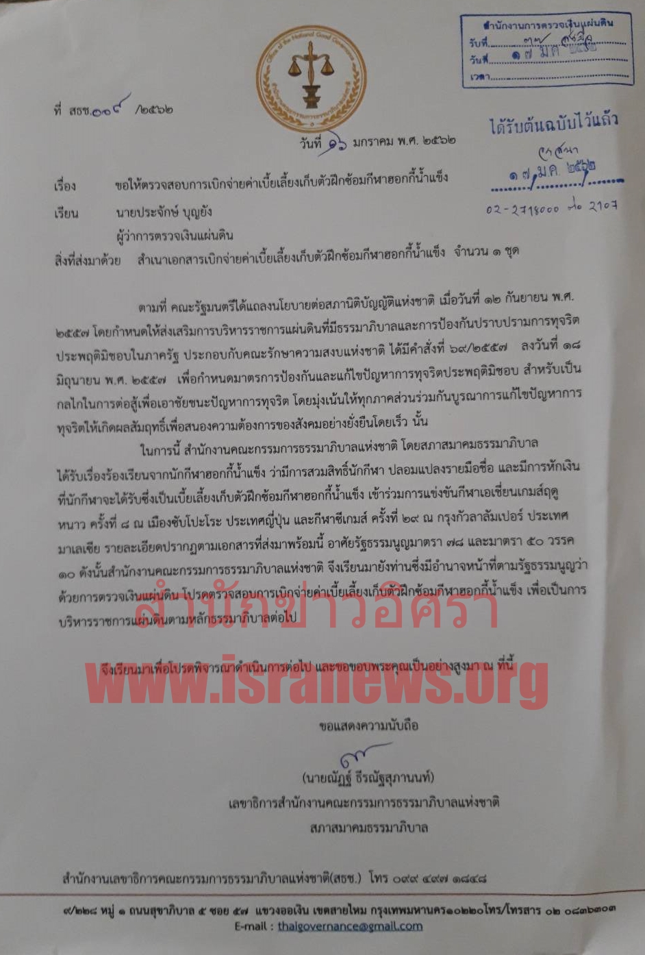 "...สํานักงานคณะกรรมการธรรมาภิบาลแห่งชาติ โดยสภาสมาคมธรรมาภิบาล ได้รับเรื่องร้องเรียนจากนักกีฬาฮอกกี้น้ำแข็ง ว่า มีการสวมสิทธิ์นักกีฬา ปลอมแปลงรายมือชื่อ และมีการหักเงิน ที่นักกีฬาจะได้รับซึ่งเป็นเบี้ยเลี้ยงเก็บตัวฝึกซ้อมกีฬาฮอกกี้น้ำแข็ง เข้าร่วมการแข่งขันกีฬาเอเชี่ยนเกมส์ฤดู หนาว ครั้งที่ 8 ณ เมืองซับโปะโระ ประเทศญี่ปุ่น และกีฬาซีเกมส์ ครั้งที่ 29 ณ กรุงกัวลาลัมเปอร์ ประเทศ มาเลเซีย รายละเอียดปรากฏตามเอกสารที่ส่งมาพร้อมนี้ อาศัยรัฐธรรมนูญมาตรา 78 และมาตรา 50 วรรค 10 ดังนั้นสํานักงานคณะกรรมการธรรมาภิบาลแห่งชาติ จึงเรียนมายังท่านซึ่งมีอํานาจหน้าที่ตามรัฐธรรมนูญว่า ด้วยการตรวจเงินแผ่นดิน โปรดตรวจสอบการเบิกจ่ายค่าเบี้ยเลี้ยงเก็บตัวฝึกซ้อมกีฬาฮอกกี้น้ําแข็ง เพื่อเป็นการ บริหารราชการแผ่นดินตามหลักธรรมาภิบาลต่อไป..."