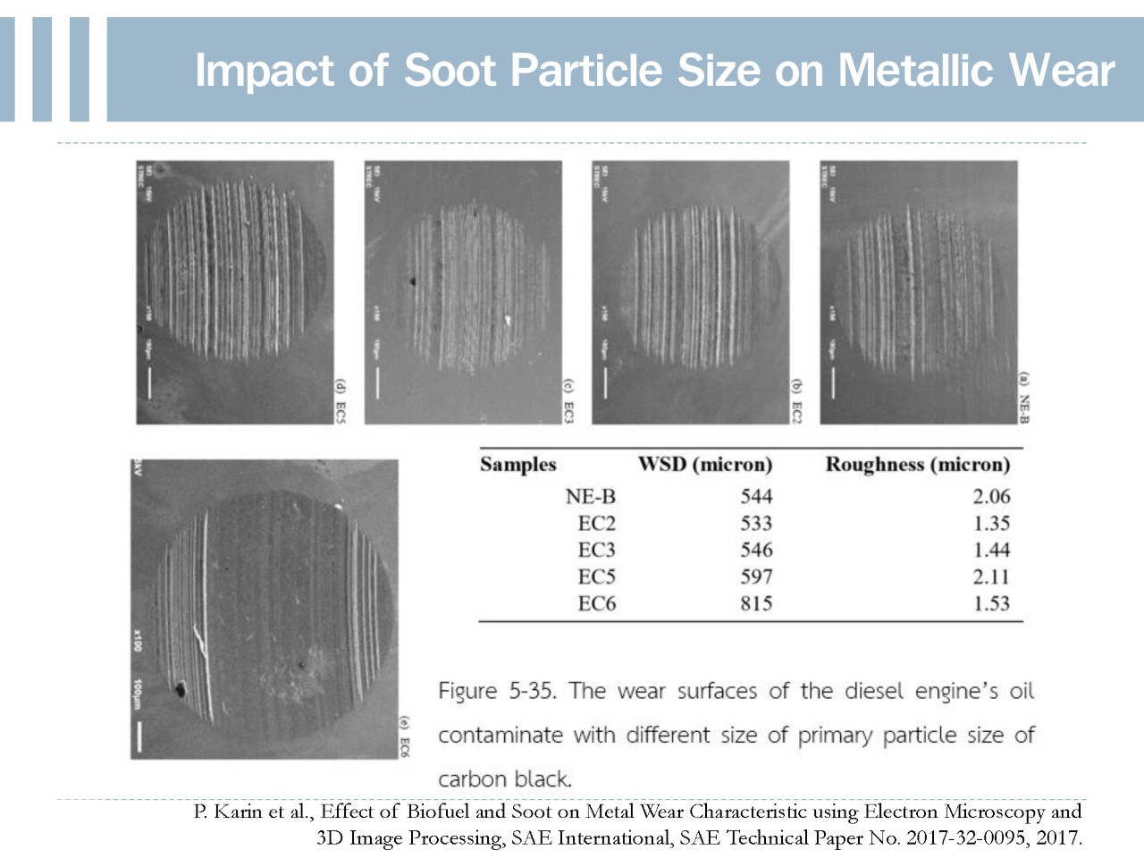 ข้อดีด้านสิ่งแวดล้อม ในงานวิจัย ผศ.ดร.ปรีชา ได้ใช้เทคนิคการถ่ายภาพด้วยกล้องอิเลคตรอน (Scanning Electron Microscopy, SEM) ศึกษาอนุภาคเขม่าแล้วนำมาวิเคราะห์ พบว่า เมื่อขนาดของเขม่าแต่ละอนุภาคเดี่ยวมีขนาดใหญ่ขึ้น จะเกิดรอยแผลบนโลหะที่มีขนาดใหญ่ขึ้นตามไปด้วย ดังนั้นจึงเป็นไปได้ว่า เขม่าของไบโอดีเซลจะทำให้เครื่องยนต์เกิดการสึกหรอน้อยกว่าเขม่าของดีเซลทั่วไปได้
