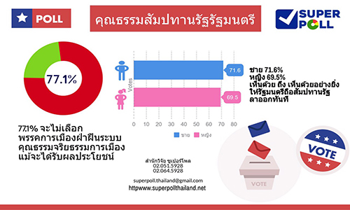 ผอ. ซูเปอร์โพล กล่าวว่า จิตใจคนไทยส่วนใหญ่สูงส่ง ไม่เลือกพรรคการเมืองที่มีปัญหาฝ่าฝืนระบบคุณธรรม จริยธรรมทางการเมืองเข้ามาบริหารประเทศชาติ ถึงแม้ตนเองจะได้ผลประโยชน์ตอบแทน แต่น่าเป็นห่วงคือ กลุ่มคนก่ำกึ่งกันระหว่างกลุ่มคนที่มองสถานการณ์การเมืองลุกลามบานปลายไม่เป็นอุปสรรคขัดเสรีภาพการเดินทางและหารายได้ของประชาชน กับกลุ่มคนที่มองว่าเป็นอุปสรรค ผู้ใหญ่อาจจะกำลังคิดเอาคณะบุคคลที่ฝ่าฝืนคุณธรรมจริยธรรมทางการเมืองมาเป็นเกราะกันชน ผู้นำประเทศ แทนที่จะเอาระบบคุณธรรมจริยธรรมทางการเมืองมาเป็นกลไกคุ้มครอง จะได้อยู่ในอำนาจต่อหรือไม่ได้อยู่ต่อ อะไรจะสำคัญเท่า ให้ระบบคุณธรรมจริยธรรมได้คงอยู่สืบต่อให้ลูกหลานมีหลักยึดหลักธรรมาภิบาลในการปกครองบ้านเมืองต่อไป