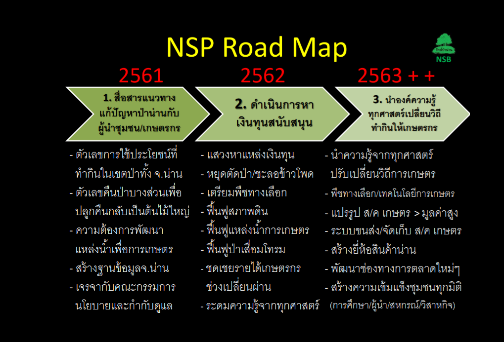 ด้านดร.วิจารย์ สิมาฉายา ปลัดกระทรวงทรัพยากรธรรมชาติและสิ่งแวดล้อม ในฐานะประธานกรรมการภาครัฐ กล่าวถึงการสร้างฐานข้อมูลจังหวัดน่านตัวเลขการใช้ประโยชน์ที่ดินทำกินในเขตป่าทั้งจังหวัดน่าน ต้องใช้เวลา 20 ปีถึงเสร็จ แต่เนื่องจากชุมชนมีฐานข้อมูลเดิมอยู่แล้ว จึงคาดว่า กรมป่าไม้จะปรับข้อมูลให้เป็นชุดเดียวกันให้เสร็จภายในปี 2563 และน่านจะเป็นตัวอย่างให้พื้นที่อื่นๆต่อไป