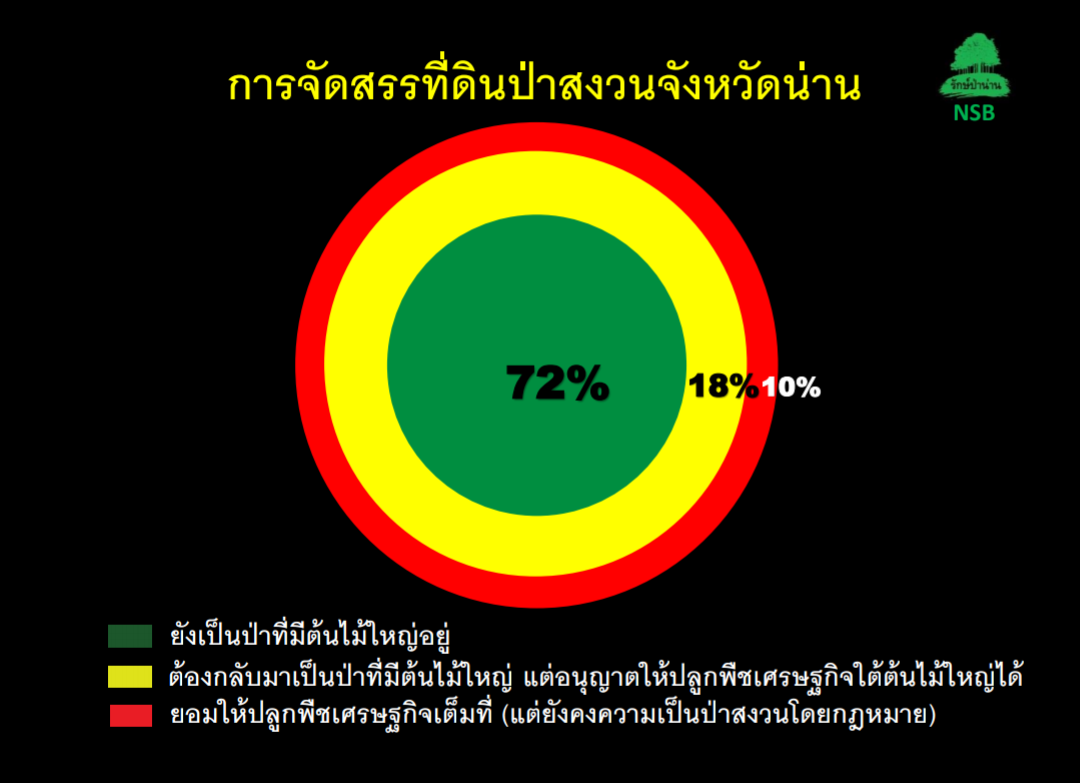 ขณะที่การจัดสรรที่ดินป่าสงวนจังหวัดน่าน เพื่อแก้ปัญหาประเด็นสิทธิที่ดินทำกินของเกษตรกรให้มีความชอบด้วยกฎหมายนั้น ประธานคณะกรรมการภาคเอกชน กล่าวว่า จังหวัดน่านจะบริหารจัดการพื้นที่ เขตป่าสงวนตามสัดส่วนดังนี้