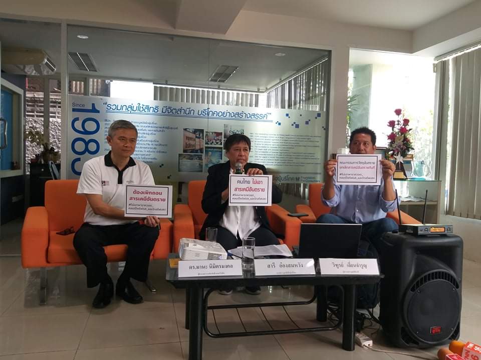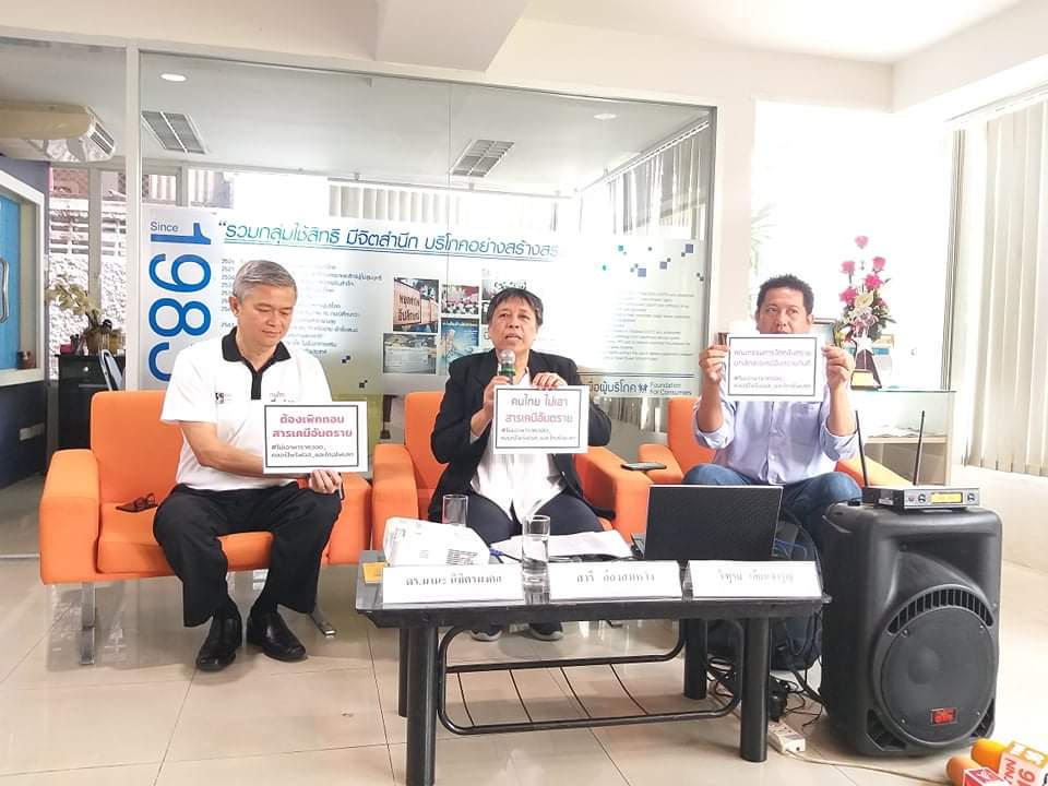 วันที่ 11 กุมภาพันธ์ 62 มูลนิธิเพื่อผู้บริโภค ได้จัดงานแถลง เรื่อง “จับตา คกก.วัตถุอันตรายตัดสินชะตาไทยจะก้าวพ้นการเป็นประเทศด้อยพัฒนาที่ยังใช้สารเคมีที่เป็นพิษต่อชีวิตพลเมืองหรือไม่” ณ ห้องประชุมชั้น 2 มูลนิธิเพื่อผู้บริโภค อนุสาวรีย์ชัยสมรภูมิ โดย นายวิฑูรย์ เลี่ยนจำรูญ ผู้อำนวยการมูลนิธิชีววิถี ดร.มานะ นิมิตมงคล เลขาธิการองค์กรต่อต้านคอร์รัปชัน (ประเทศไทย) และนางสาวสารี อ๋องสมหวัง เลขาธิการมูลนิธิเพื่อผู้บริโภค ร่วมแถลง