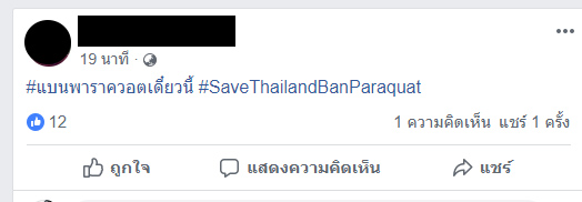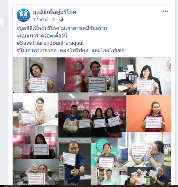 ทำให้เครือข่ายภาคประชาชน ผู้รักสุขภาพ ผู้หวงแหนสิ่งแวดล้อม ได้ชักชวนให้ประชาชนโพสต์ข้อความพร้อมกันในวันนี้ (12 ก.พ. 2562) เวลา 12.00 น. โดยติดแฮชแท็ก #เเบนพาราควอตเดี๋ยวนี้ #SaveThailandBanParaquat เเละ #ไม่เอาพาราควอต_คลอร์ไพริฟอส_เเละไกลโฟเซต หรือเขียนข้อความ Inbox ถึงคณะกรรมการวัตถุอันตราย เพื่อสนับสนุนการเพิกถอนสารเคมีอันตราย