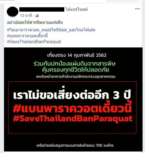 ภาคปชช. ดีเดย์ 12 ก.พ. 62 เที่ยงตรง โพสต์ข้อความ ติดเเฮชเเท็กต้านสารเคมีอันตราย #เเบนพาราควอตเดี๋ยวนี้ กดดันคกก.วัตถุอันตราย ทบทวนมติต้องยกเลิก
