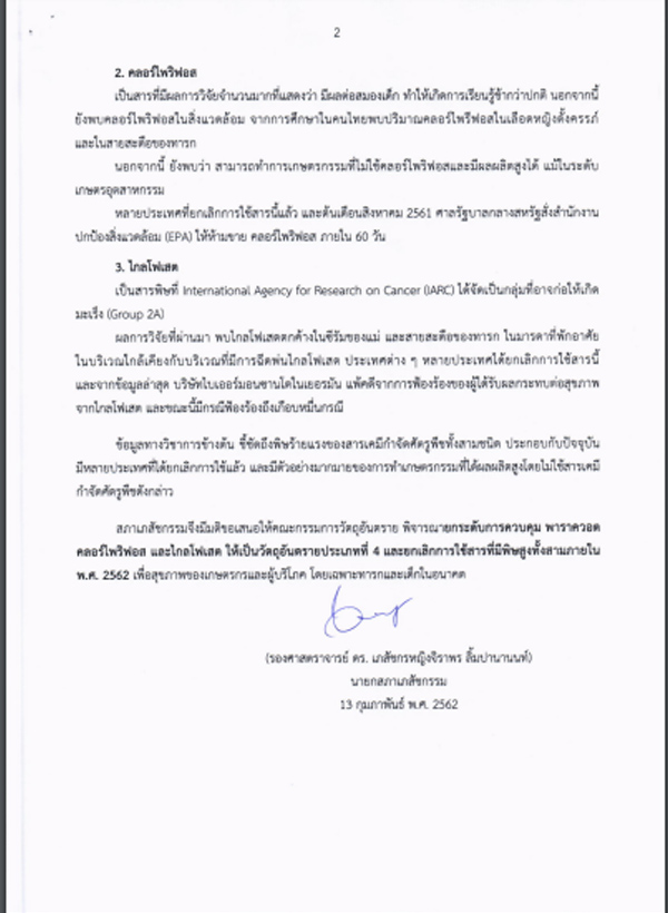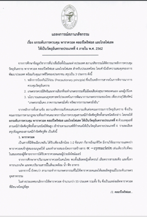 ผู้สื่อข่าวรายงานเพิ่มเติมว่า วันที่ 13 ก.พ. 2562 สภาเภสัชกรรม ออกเเถลงการณ์เสนอให้คณะกรรมการวัตถุอันตรายพิจารณายกระดับการควบคุม พาราควอต คลอร์ไพริฟอส เเละไกลโฟเซต ให้เป็นวัตถุอันตรายประเภทที่ 4 เเละยกเลิกการใช้สารที่มีพิษสูงทั้งสามภายในปี 2562 เพื่อสุขภาพของเกษตรกรเเละผู้บริโภค โดยเฉพาะทารกเเละเด็กในอนาคต